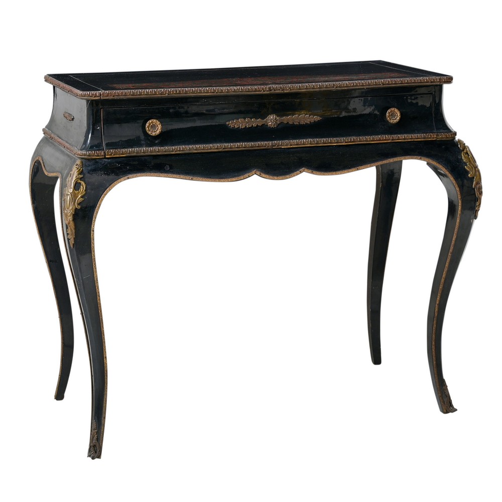 Tavolo consolle in legno ebanizzato e decori in ottone fuso.