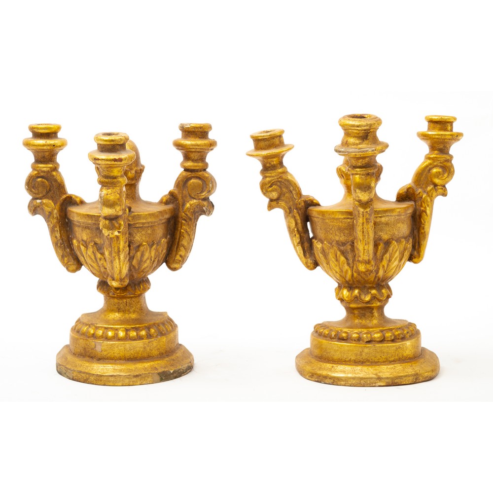 COPPIA CANDELIERI da altare a tre fiamme in legno dorato.