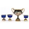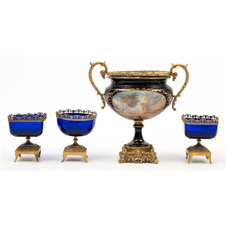 CENTROTAVOLA in porcellana con asse e base in bronzo e tre coppette in vetro blu con basi in bronzo dorato.