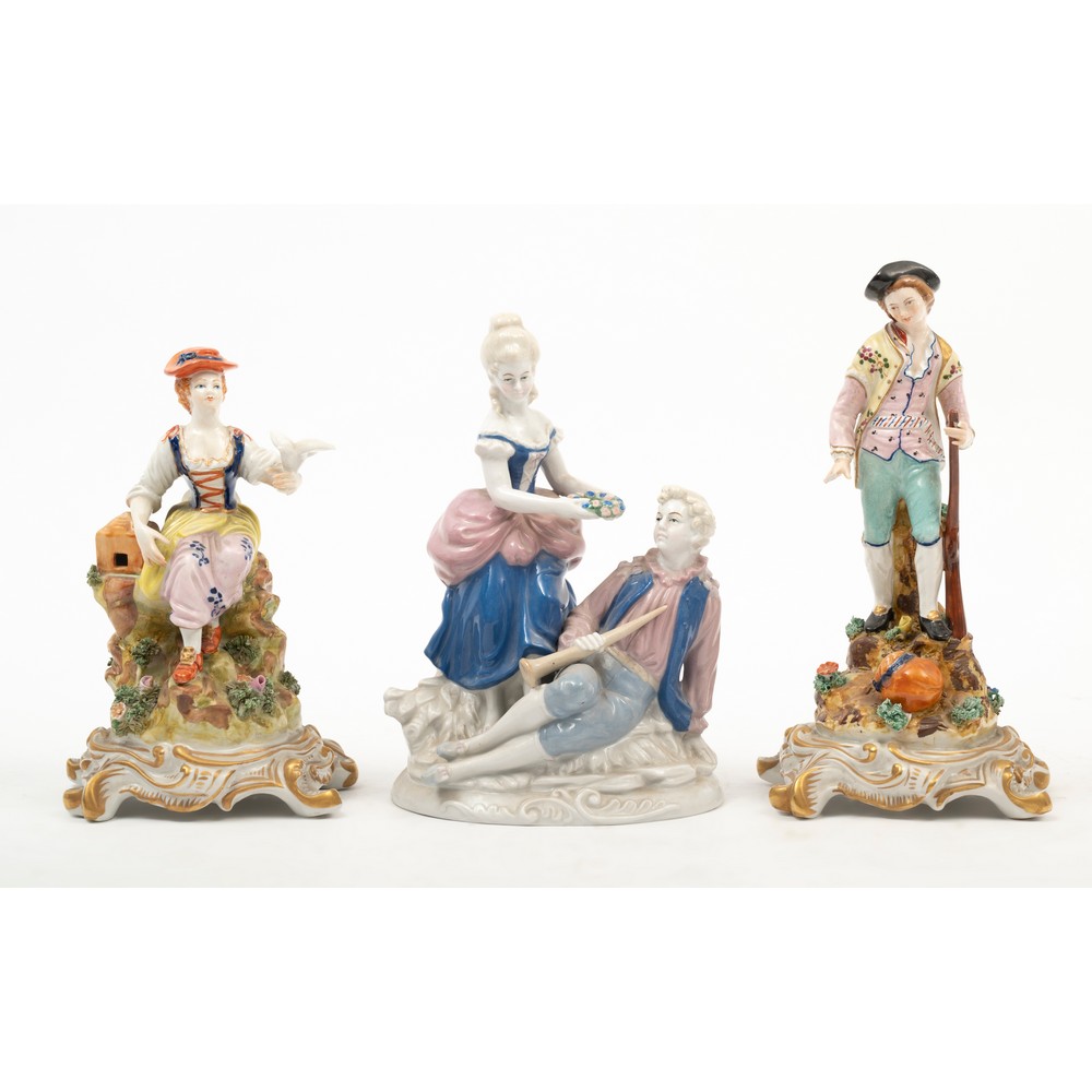 TRE STATUETTE IN PORCELLANA raffiguranti cacciatore, fanciulla e giovani fanciulli (mancanze).