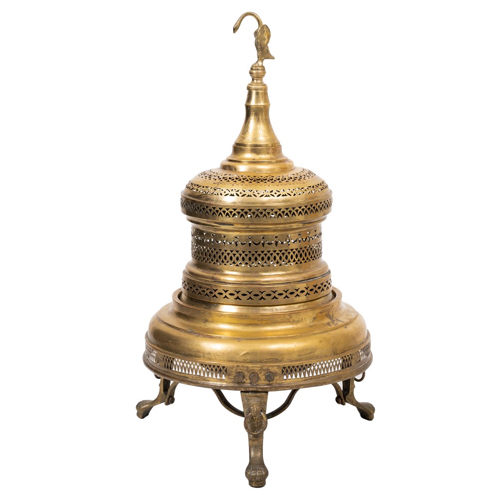BRACIERE in ottone con base rotonda a tre piedi a zampa leonina.