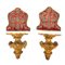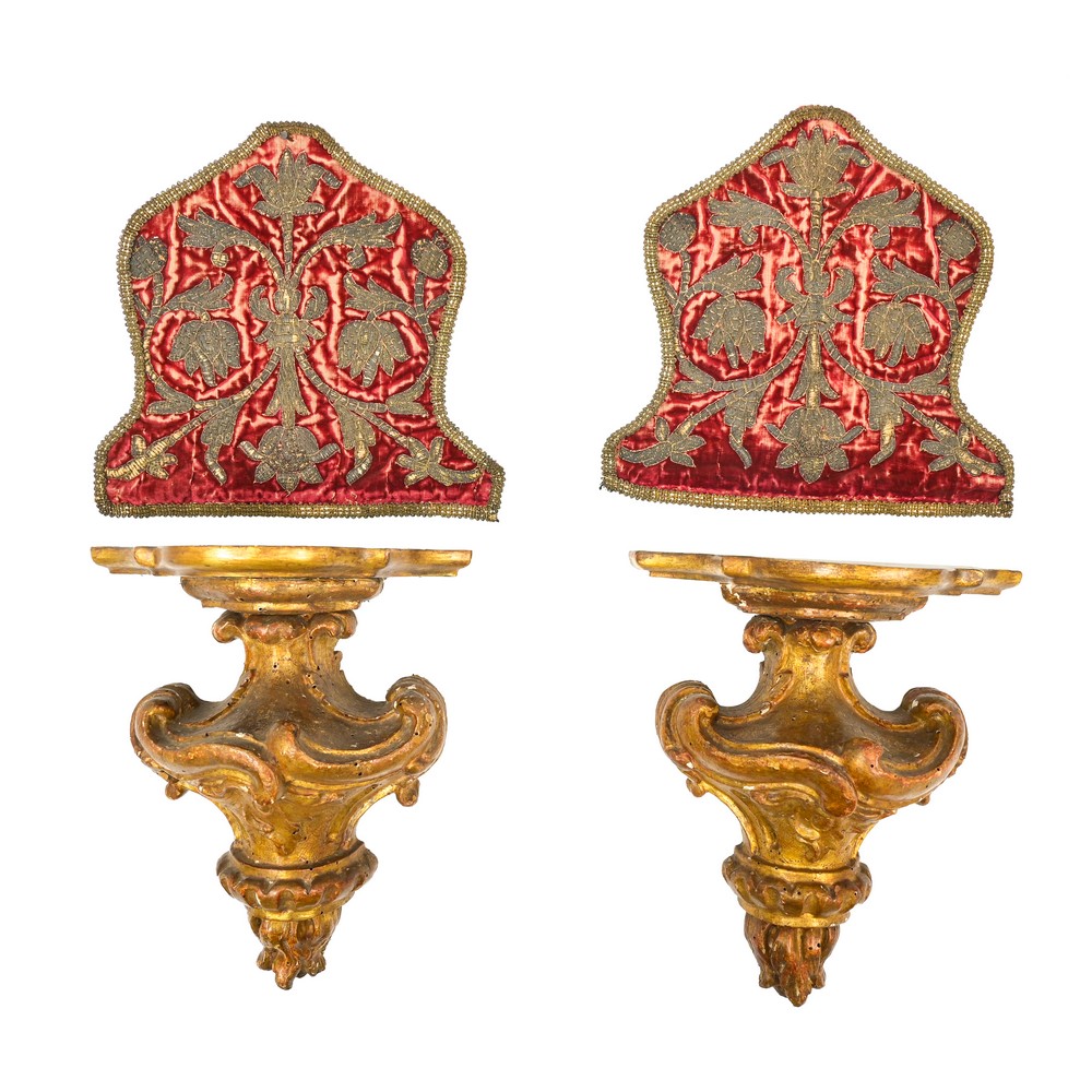 Coppia piccole mensole in legno dorato e laccato con coppia di scudi in stoffa lavorati a mano.