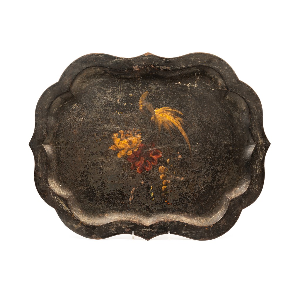 Vassoio in latta di forma sagomata, dipinta a motivo naturalistico.