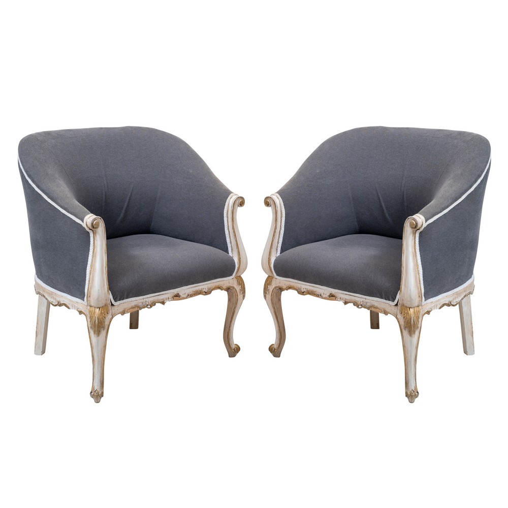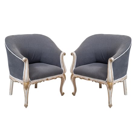 COPPIA DI POLTRONE di gusto barocco in legno laccato e dorato (lievi mancanze).