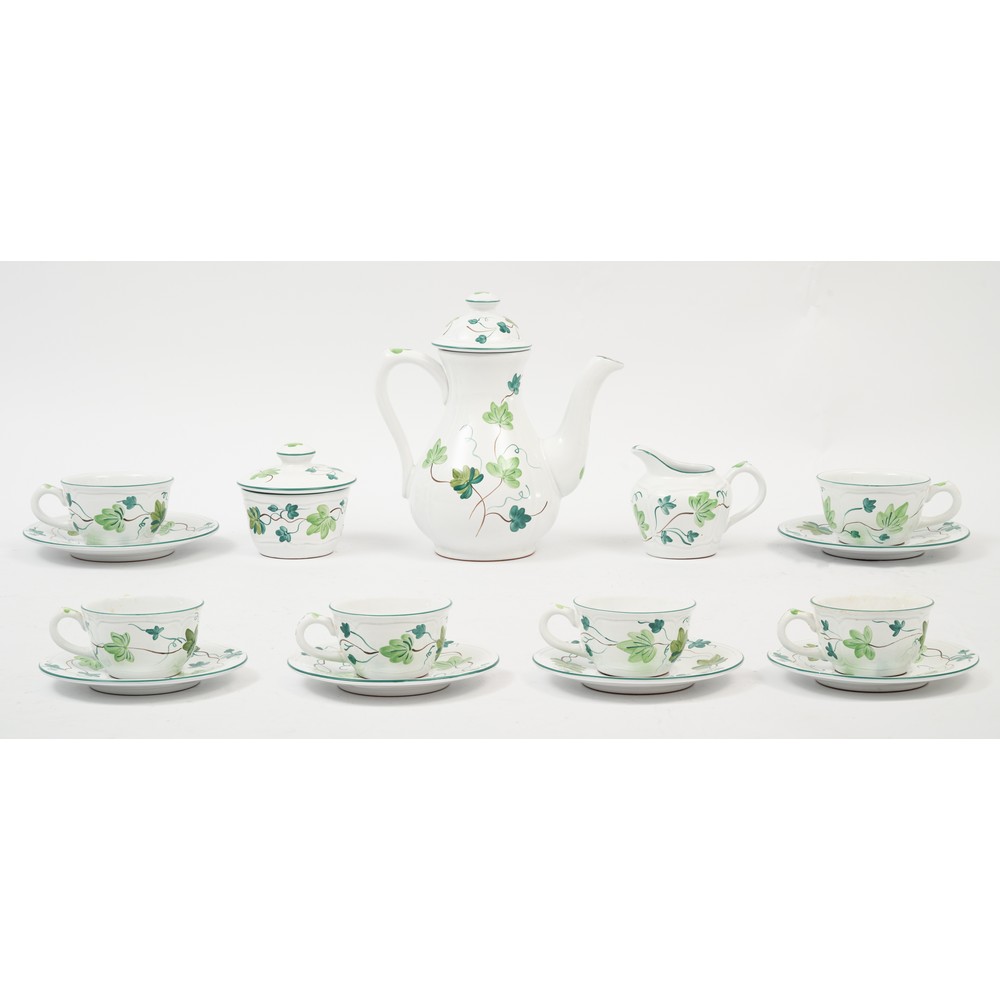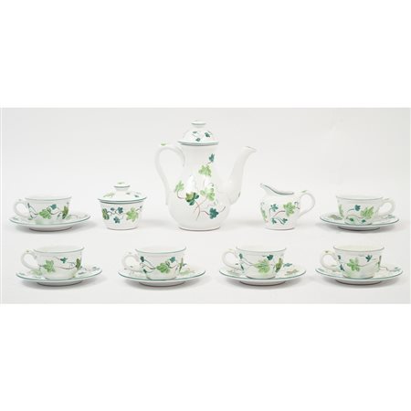 Servizio da tè in ceramica composto da teiera, zuccheriera, lattiera e 12 tazze con piattino (lieve sbeccatura alla teiera).