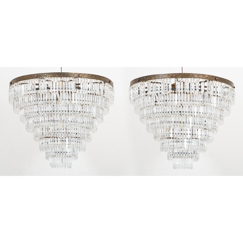 COPPIA DI LAMPADARI ad otto luci in ottone con gocce in vetro.