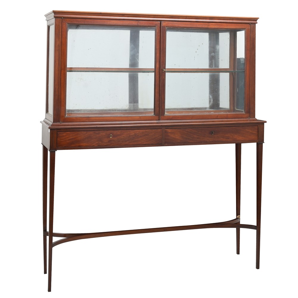 ESPOSITORE CON CONSOLLE a due ante e due cassetti in legno di mogano.