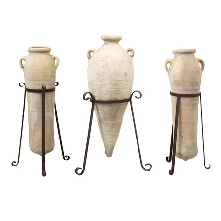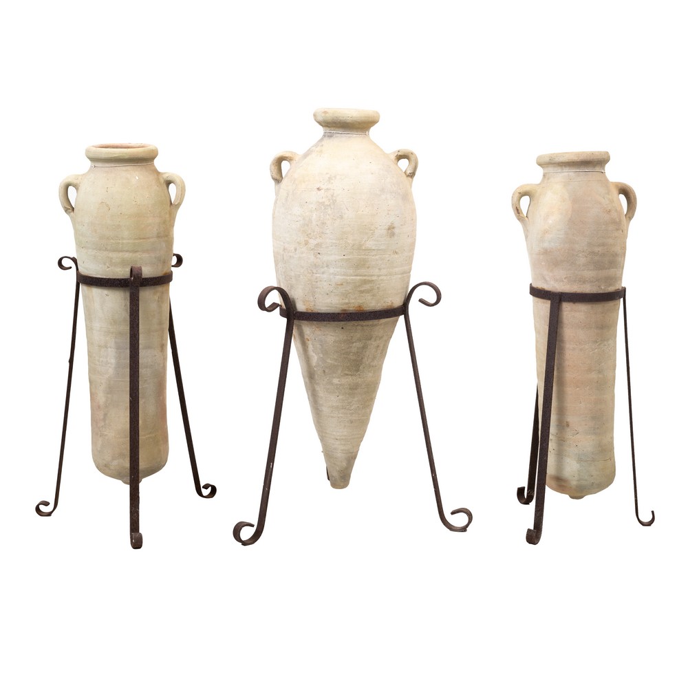 TRE CONTENITORI in terracotta con elementi in ferro.