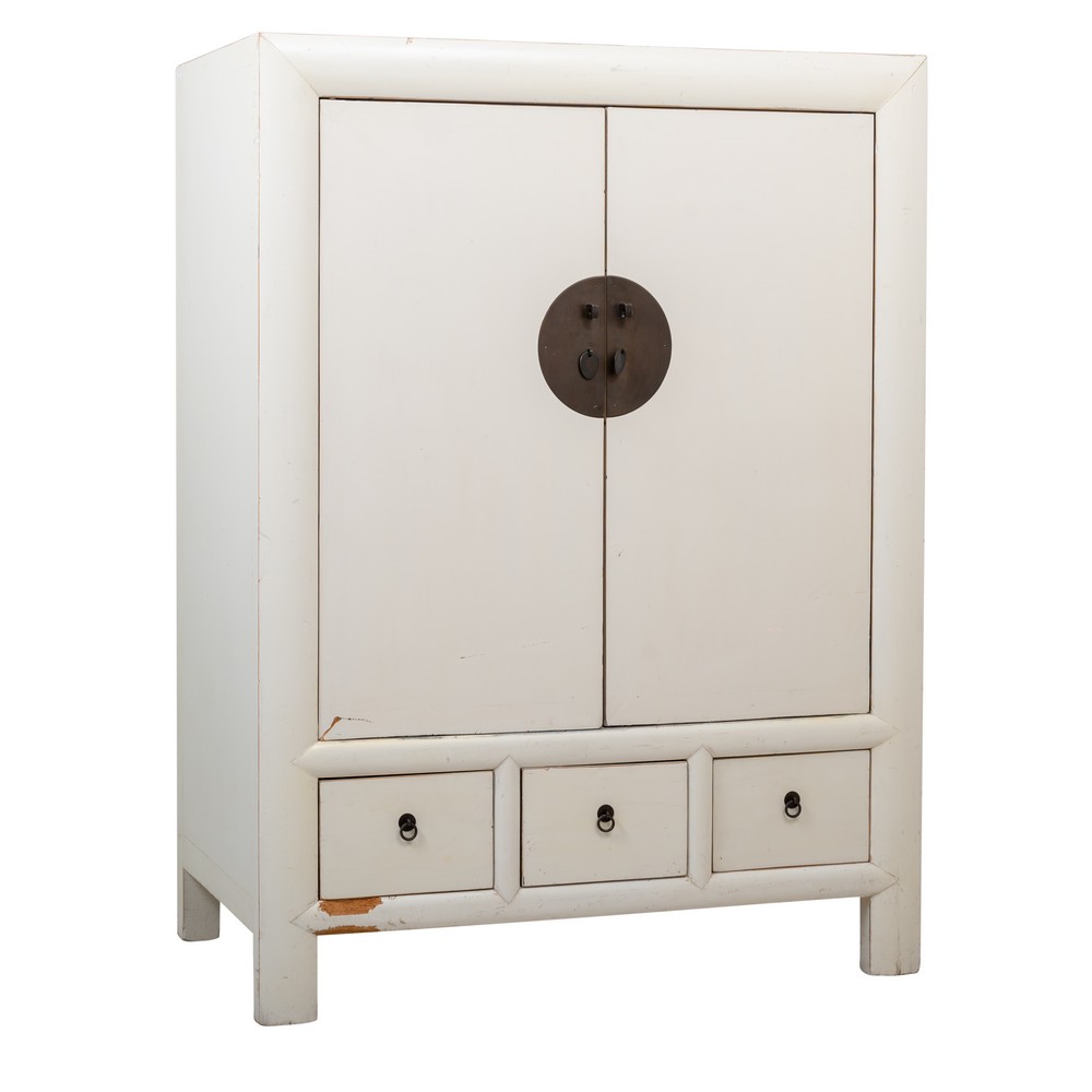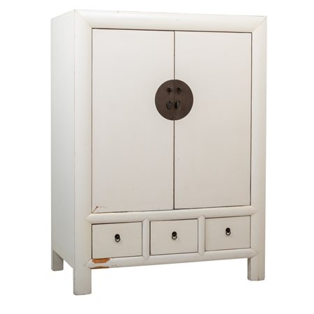 ARMADIO di gusto orientale in legno laccato bianco a due ante e tre cassetti (usure).