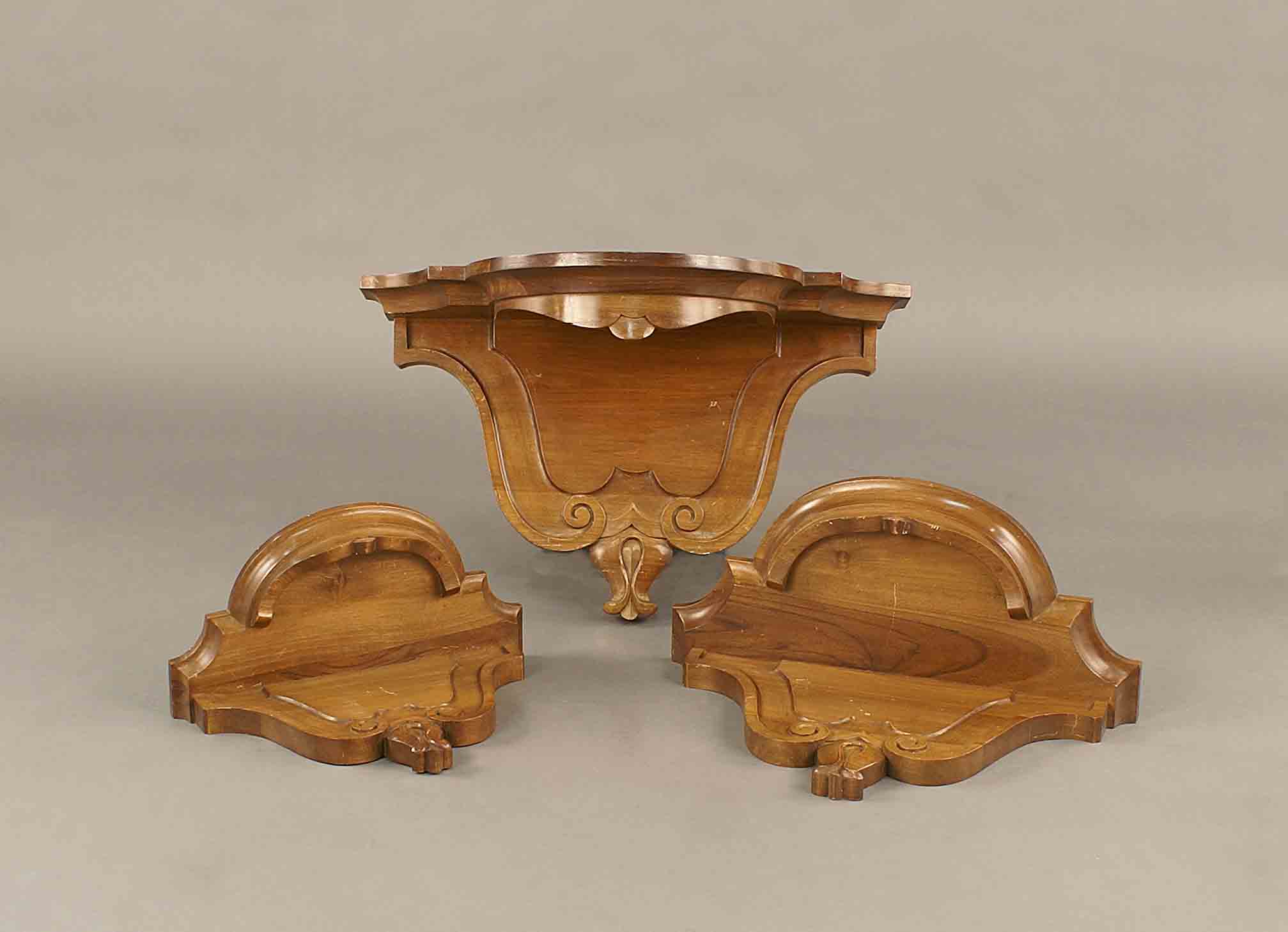 Set di tre mensoline in noce intagliato, misure diverse, vecchia manifattura.