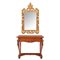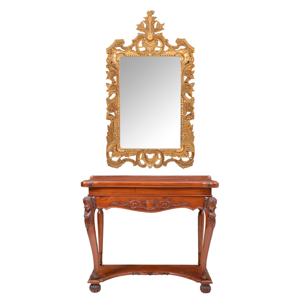 CONSOLLE di gusto eclettico in legno di mogano con specchiera in legno dorato, riccamente intagliato.