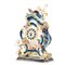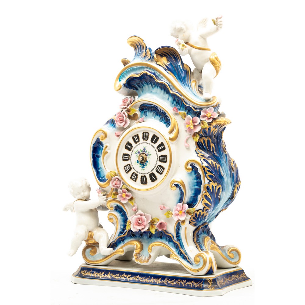 Orologio da tavolo in porcellana di Sevres decorata e dipinta a mano con sculture raffigurante putti, lumeggiature in oro (piccole mancanze).