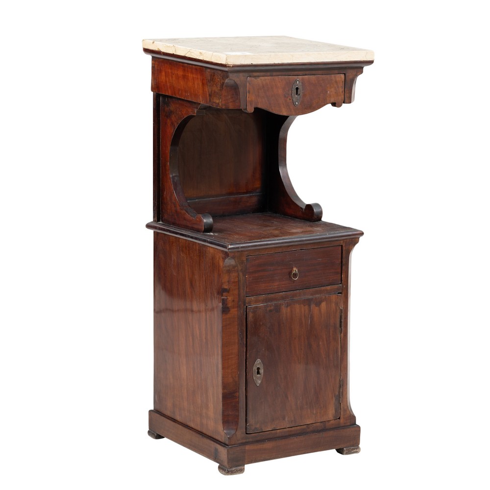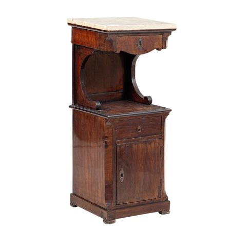 Comodino Luigi Filippo in mogano e piuma di mogano, piano in marmo bianco venato.
