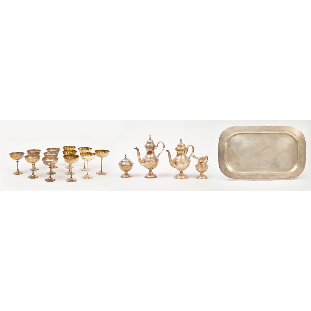 Vassoio, due caffettiere, zuccheriera, lattiera e 12 coppe champagne in metallo argentato.