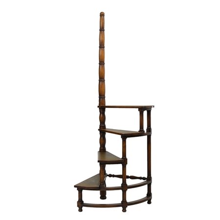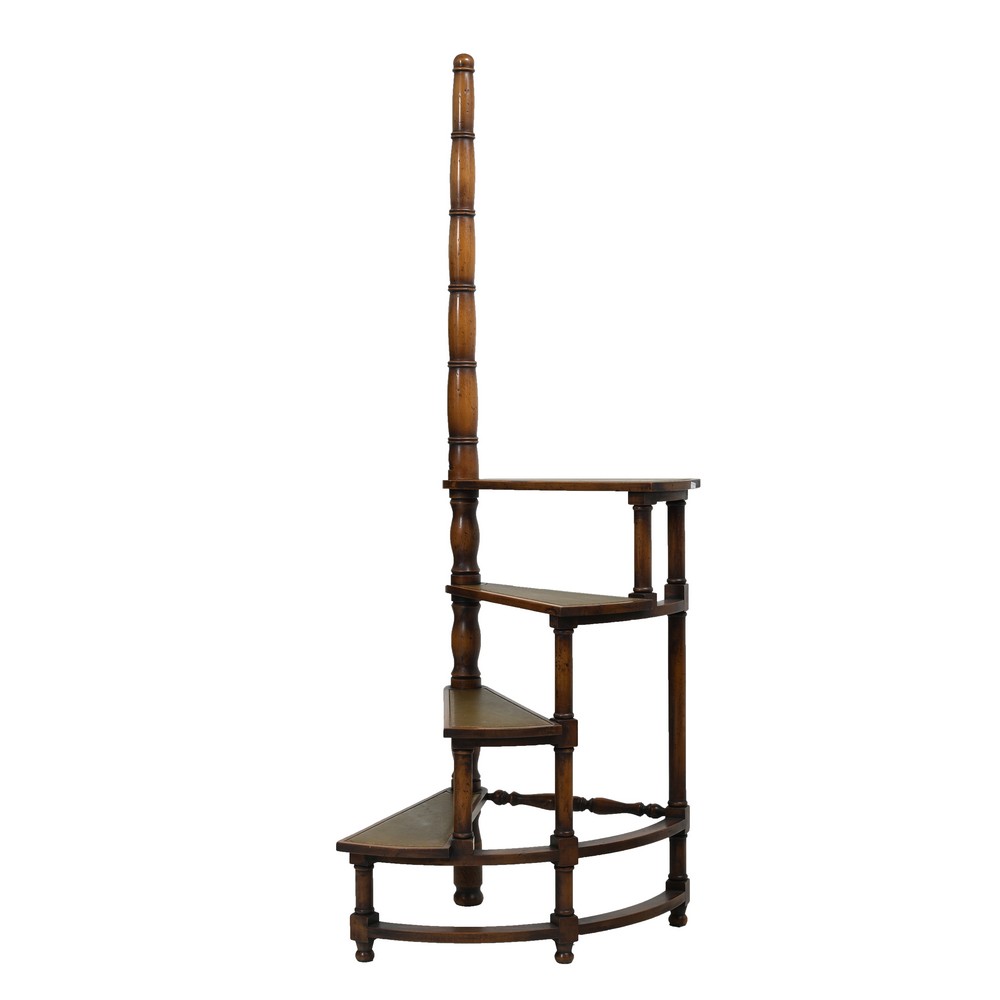 Scala a chiocciola da biblioteca in noce con scalini rivestiti in pelle con bordura dorata.