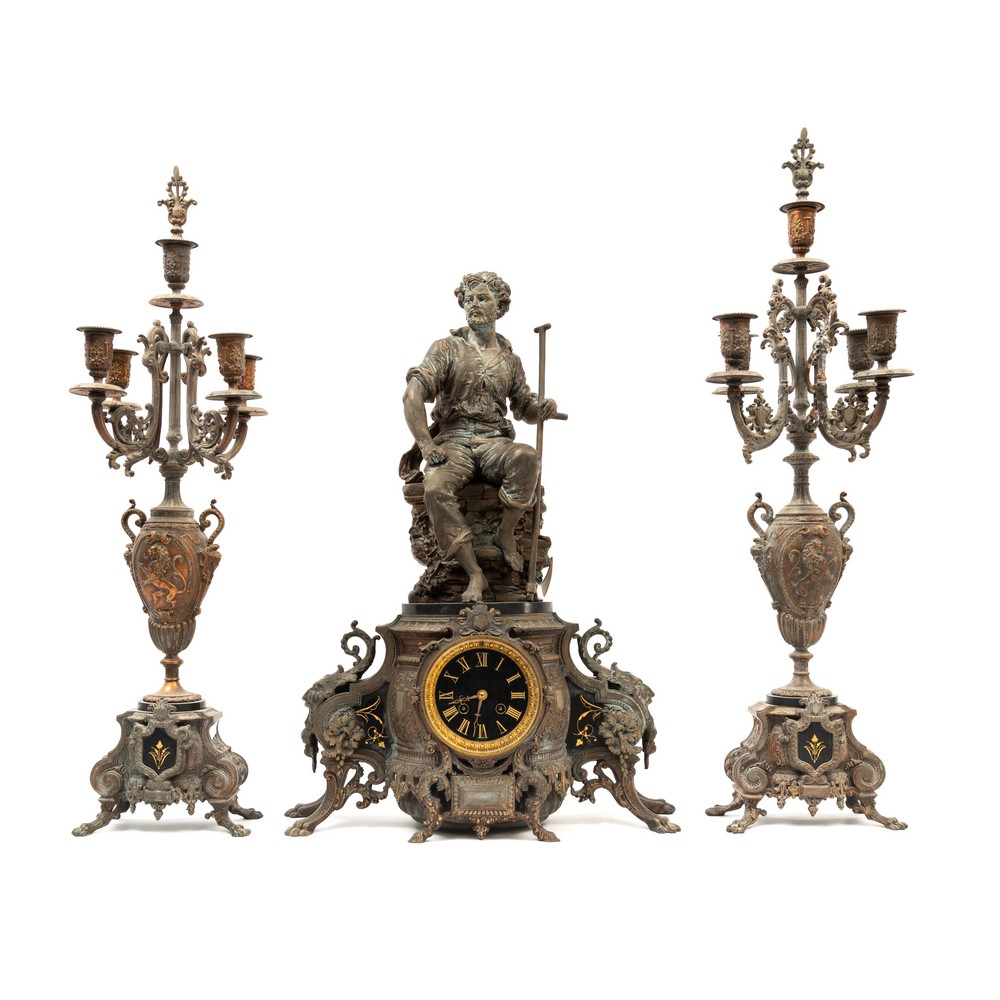 composto da orologio con scultura raffigurante "Contadino" e coppia di candelabri a 5 fiamme.