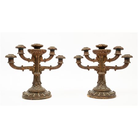 Coppia candelabri in legno scolpito e dorato a 5 fiamme.