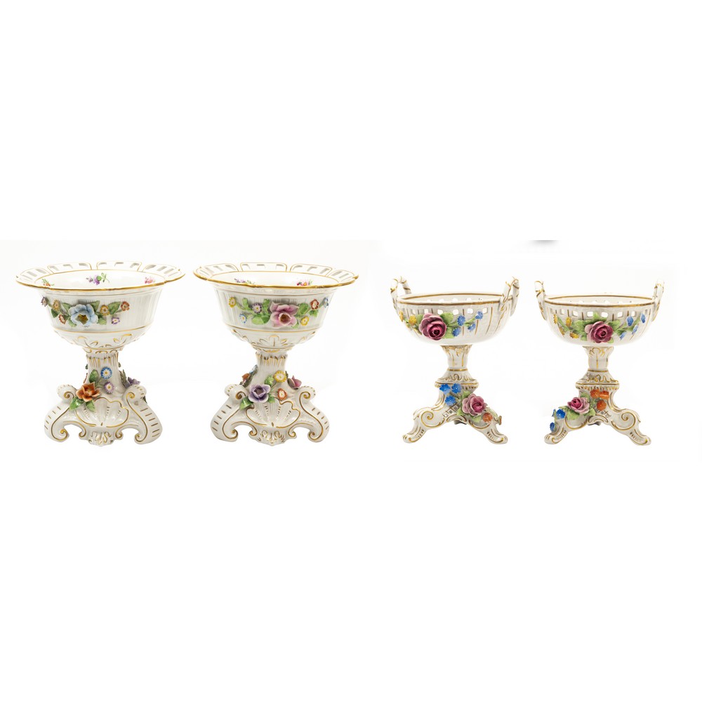 DUE COPPIE DI ALZATINE in porcellana di Capodimonte policroma con decori a motivi floreali (usure).