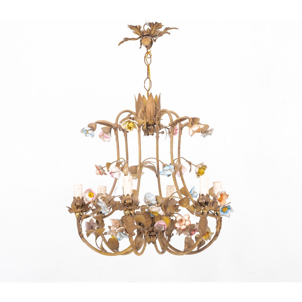 LAMPADARIO a sei luci in ferro dorato con fregi in porcellana (usure e mancanze).