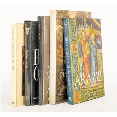 CINQUE VOLUMI D’ARTE: 1) AA. VV. ARAZZI DELLA BASILICA DI SAN MARCO, ed. Rizzoli, 1999. Legatura editoriale in piena tela rigida e sopraccoperta editoriale illustrata con ali. Cm 31 x 22. Pp. 223. Con un copioso apparato di immagini. 2) Francesco Federico Mancini PINTORICCHIO, ed. Silvana 2007. Legatura editoriale in piena tela rigida e sopraccoperta editoriale illustrata con ali. Titoli dorati al dorso. Cm 34 x 25. Pp. 272. Con un copioso apparato di immagini.3) Claudio Strinati / Rossella Vodret – a cura di - PALAZZO CHIGI, ed. Electa 2001. Legatura editoriale in piena tela rigida e sopraccoperta editoriale illustrata con ali. Cm 29 x 26. Pp. 287. Con un copioso apparato di immagini. Volume contenuto in custodia editoriale illustrata a specchio. 4) AA. VV. DISEGNO ITALIANO, ed. Redoff 1979. Legatura editoriale in piena tela rigida e sopraccoperta editoriale illustrata con ali. Cm 31 x 26. Pp. 135 (4). Con un copioso apparato di grafica e immagini. 5) AA. VV. LE STANZE DEL CARDINALE MONTI 1635 - 1650. LA COLLEZIONE RICOMPOSTA, ed. Leonardo Arte, 1994. Brossura editoriale illustrata con ali. Cm 29 x 25. Qualche sporcizia alla coperta. Interno in perfette condizioni. Pp. 286 con testo stampato su più colonne.