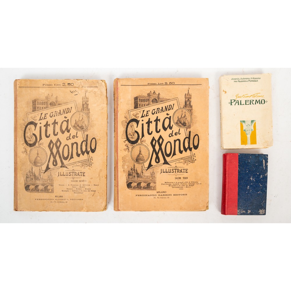 QUATTRO VOLUMI DI CUI 2 DI GEOGRAFIA E 2 STRADARI DI PALERMO: 1) AA. VV. LE GRANDI CITTA’ DEL MONDO ILLUSTRATE, 2 volumi (il 2° e 3°), ed. Milano, Ferdinando Garbini Editore 1883 – 1884. Legature editoriali rigide illustrate. In 8° grande. Pp. 181 (vol. 2°); 191 (vol 3°). 2) STRADARIO DELLA CITTA’ DI PALERMO, ed. Azienda Autonoma di Turismo per Palermo e Monreale, 1951. In 16°. Con lo stradario realizzato a rubrica alfabetica. Rilegatura successiva contenente la brossura originale. Pp. 263 e svariate pagine pubblicitarie in testa e in fine. 3) Gaetano Falzone PALERMO, ed. Azienda Autonoma di Turismo per Palermo e Monreale, 1956. In 16°. Brossura editoriale figurata e marginosa. Con una grande mappa della città più volte ripiegata infine. In ottime condizioni. Pp. 116 con svariate tavole f. t.