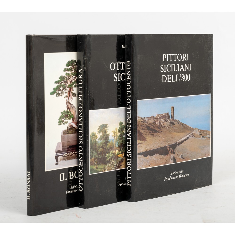 TRE VOLUMI DELLE EDIZIONI FONDAZIONE WHITAKER: 1) Maria Accascina OTTOCENTO SICILIANO. PITTURA, 1982. Legatura editoriale con sopraccoperta editoriale illustrata. Cm 31 x 24. Pp. 171 e LXIX tavole f. t. a colori.2) Irma Mattarella – a cura di - PITTORI SICILIANI DELL’800, 1982. Legatura editoriale con sopraccoperta editoriale illustrata. Cm 31 x 24. Pp. 30 e CXXV tavole f. t. a colori. 3) AA. VV. IL BONSAI, 1983. Legatura editoriale con sopraccoperta editoriale illustrata. Cm 31 x 23. Pp. 109 con numerose tavole a colori.