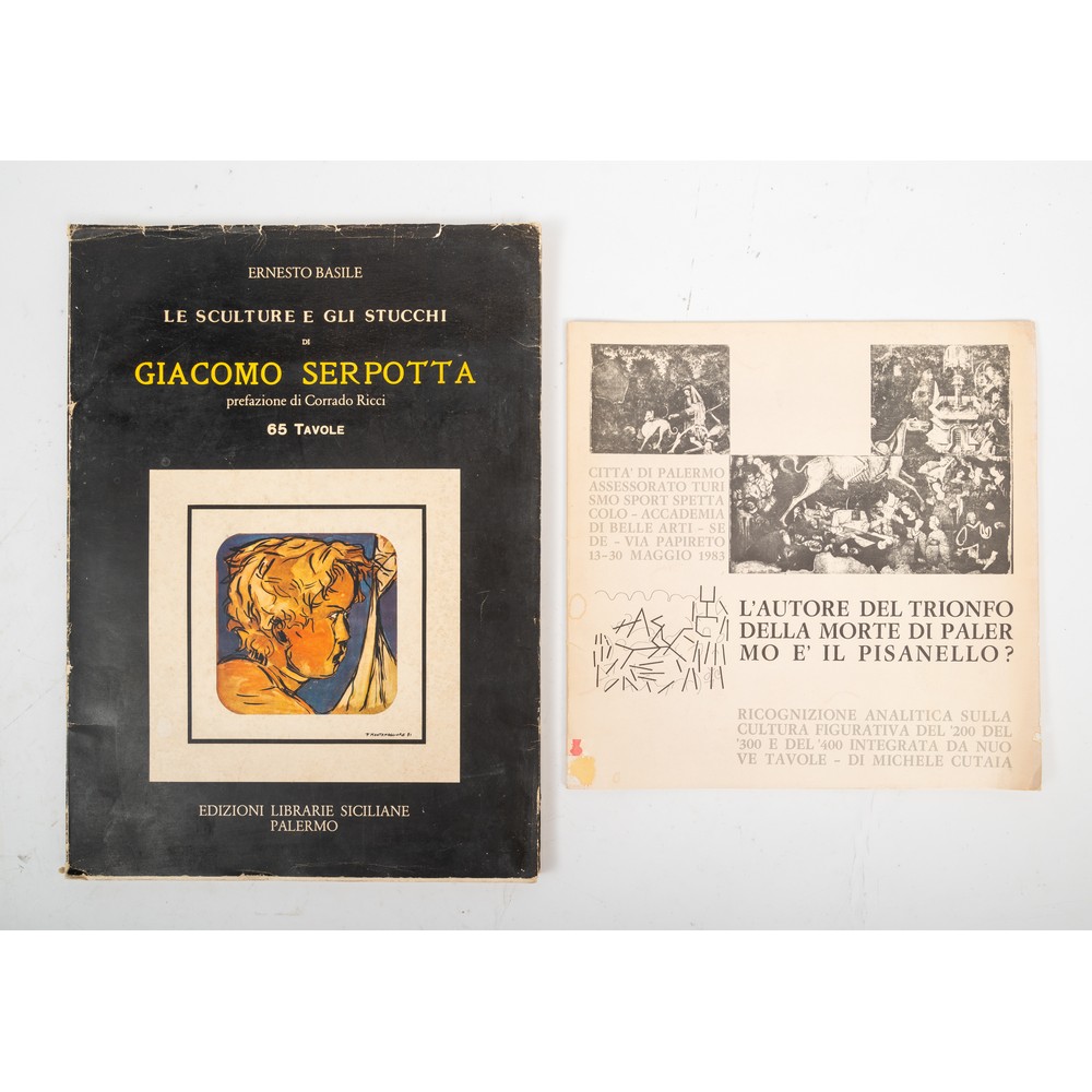DUE VOLUMI D’ARTE: 1) Michele Cutaia L’AUTORE DEL TRIONFO DELLA MORTE E’ IL PISANELLO?, ed. Palermo 1983. Brossura editoriale illustrata. In formato carré cm 31 x 31. Usure d’uso. Pp. 77. 2) Ernesto Basile LE SCULTURE E GLI STUCCHI DI GIACOMO SERPOTTA, ed. Edizioni Librarie Siciliane. In folio. Brossura editoriale illustrata con alette. Usure d’uso. Pp. (16) e 68 tavole.