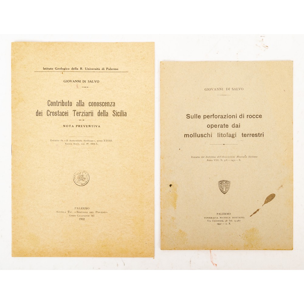DUE RARI OPUSCOLI SU MOLLUSCHI E CROSTACEI TERZIARII DELLA SICILIA dello studioso e scienziato Giovanni Di Salvo: 1) SULLE PERFORAZIONI DI ROCCE OPERATE DAI MOLLUSCHI LITOFAGI TERRESTRI, ed. Palermo, Tipografia Michele Montaina 1932. Brossura editoriale. Pp. 10 con tavole in b/n. alcune macchie d’uso alla brossura. 2) CONTRIBUTO ALLA CONOSCENZA DEI CROSTACI TERZIARII DELLA SICILIA, ed. Palermo, Scuola Tip. Boccone del Povero 1932. Brossura editoriale. Pp. (6) con tavole in b/n. in perfette condizioni.