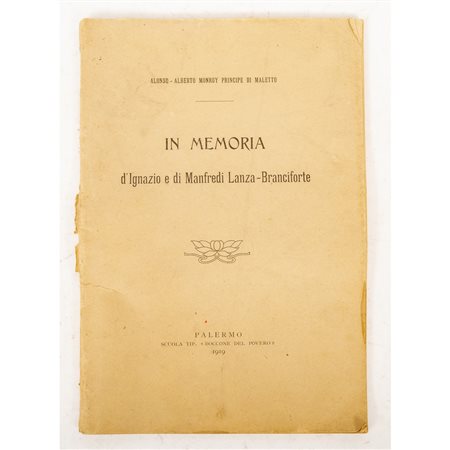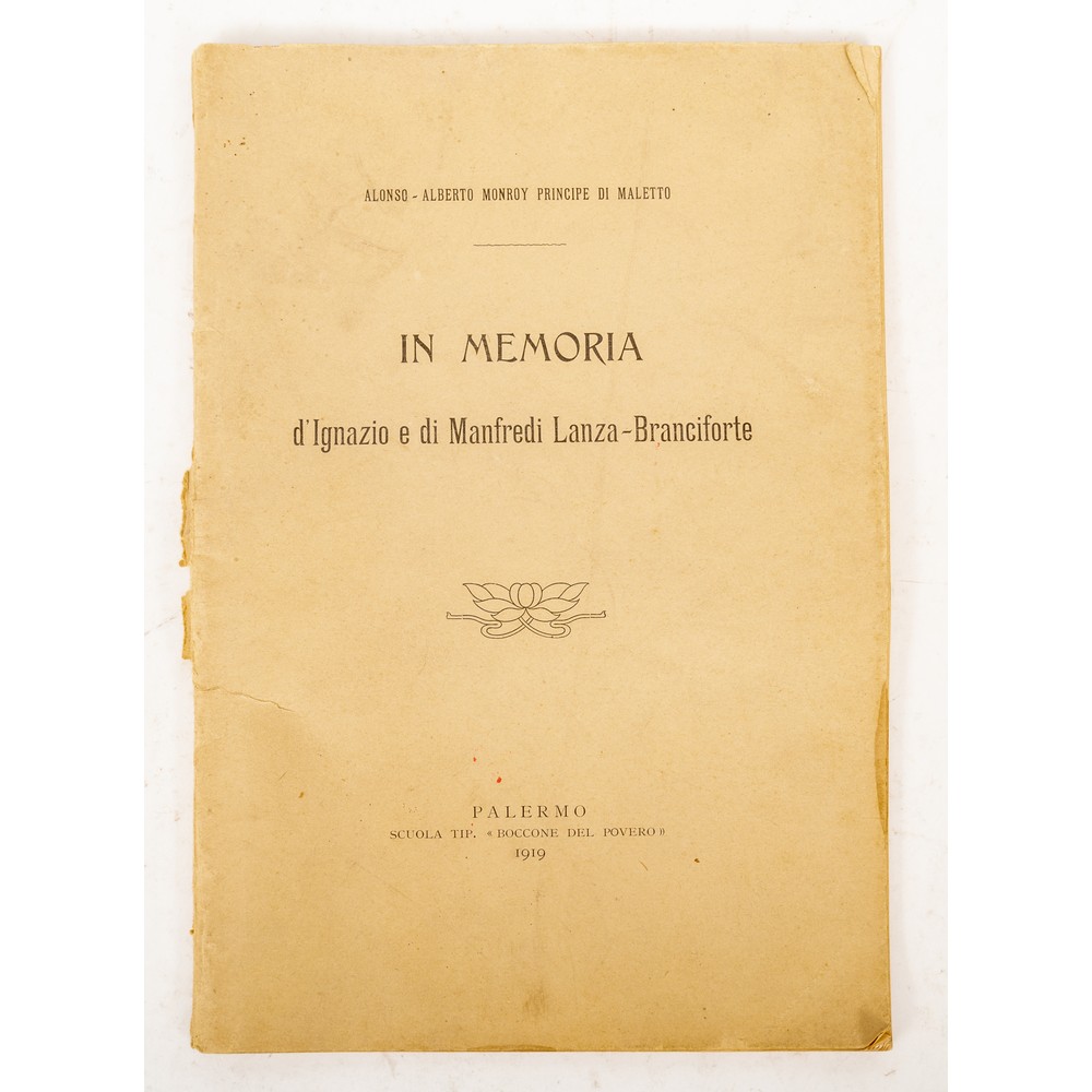 Alonso Alberto Monroy Principe di Maletto IN MEMORIA D’IGNAZIO E DI MANFREDI LANZA BRANCIFORTE, ed. Palermo, Scuola Tip. Boccone del Povero 1919. In 8° grande. Brossura editoriale. Leggero guasto al dorso e strappetto al piatto. Pp. 59. All’interno del volume ( documento a parte) una foto della lapide commemorativa dedicata ai due fratelli dall’Associazione Arma di Cavalleria.