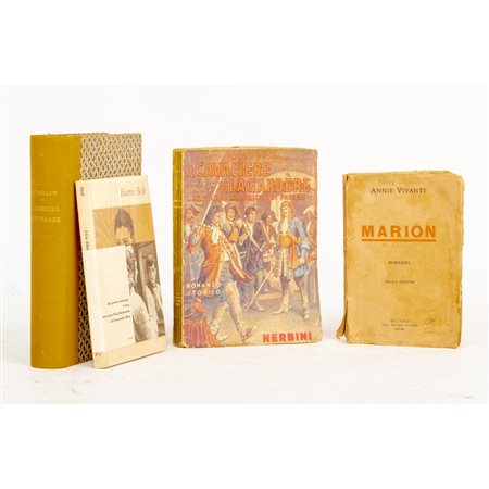 QUATTRO ROMANZI IN MISCELLANEA: 1) Beatrix Beck LEON MORIN PRETE, ed. Einaudi 1961. 1^ edizione. Da questo romanzo fu tratto il film con Jean Paul Belmondo ed Emmanuelle Riva. Cm 20 x 13. Brossura editoriale con acetato protettivo editoriale e striscia pubblicitaria originale. In perfette condizioni. Pp. 200. 2) Annie Vivanti MARION, ed. Riccardo Quintieri, Milano 1921. Cm 20 x 13. Brossura editoriale e tagli irregolari. Usure d’uso ai piatti e al dorso. In buone condizioni. Pp. 225 (5). 3) Paolo Feval IL CAVALIERE DI LAGARDERE, ed. Nerbini, Firenze 1956. Cm 23 x 17. Brossura editoriale illustrata. Tagli irregolari. In ottime condizioni. Pp. 165 (1). 4) F. D. Guerrazzi L’ASSEDIO DI FIRENZE, ed. Nerbini 1908. Edizione integrale. Due tomi in unica rilegatura. In ottime condizioni. Ombreggiature ai tagli. Bella rilegatura in mezza pelle con piatti cartonati. Pp. 480 (tomo 1); 448 (tomo 2).