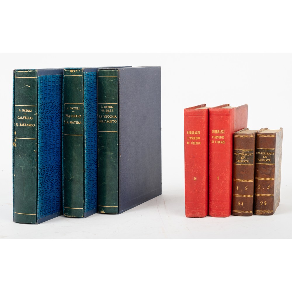 SETTE VOLUMI di romanzi del XIX e XX secolo: 1) Francesco Domenico Guerrazzi L’ASSEDIO DI FIRENZE, ed. Libreria Dante Alighieri, Milano 1871. in 2 volumi. In 8°. Rilegature successive in mezza tela e piatti cartonati con titoli in oro al dorso. Pp. 682 (4); 682 (3) con incisioni f.t. 2) Walter Scott IL TALISMANO O RICCARDO IN PALESTINA, ed. Livorno, Tipografia Vignozzi 1826. In 16°. Quattro tomi in due volumi. Due belle incisioni alle antiporte. Raro in questa edizione. Rilegature coeve in mezza pelle con piatti marmorizzati e titoli impressi in oro al dorso. Tagli colorati. Incisioni alle antiporte dei 4 tomi. Pp. 216; 212; 227; 211.3) Luigi Natoli CALVELLO IL BASTANDO, ed. S. F. Flaccovio 1973. In 8°. Pp. 549 (6). LA VECCHIA DELL’ACETO, ed. S. F. Flaccovio 1976. Pp. 402. Nota introduttiva di Salvatore Salomone Marino. A cura di Giuseppe Bonomo. FRA DIEGO LA MATINA, ed. S. F. Flaccovio 1975. Pp. 403. Volume arricchito da illustrazioni in bianco e nero nel testo. Saggio introduttivo di Leonardo Sciascia. I tre volumi sono rilegati in mezza pelle con piatti in cartone rigido rivestito. Ogni volume è contenuto in una robusta custodia muta in cartonato rigido rivestita in finta pelle. Stampati su due colonne.