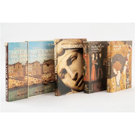 QUATTRO VOLUMI D’ARTE: 1) Francesco Basile STORIA DELL’ARTE IN SICILIA, ed. Le Edizioni del Sole 1984. 2 volumi di cm 32 x 22. Legatura editoriali rigide telate illustrate. Pp. 462; 269. 2) Mario Rivosecchi ARTE A ROMA DAL BORROMINI AL CANOVA, ed. Editalia 1978. Cm 32 x 25. Legatura editoriale rigida plastificata e sopraccoperta illustrata. Volume contenuto in cofanetto rigido illustrato a specchio. Pp. 244 ( 2). 3) Roberto Salvini MICHELANGELO, ed. Arnoldo Mondadori Editore 1977. Cm 34 x 24. Legatura editoriale in tela con sopraccoperta editoriale illustrata. Titoli dorati al dorso. Pp. 191.