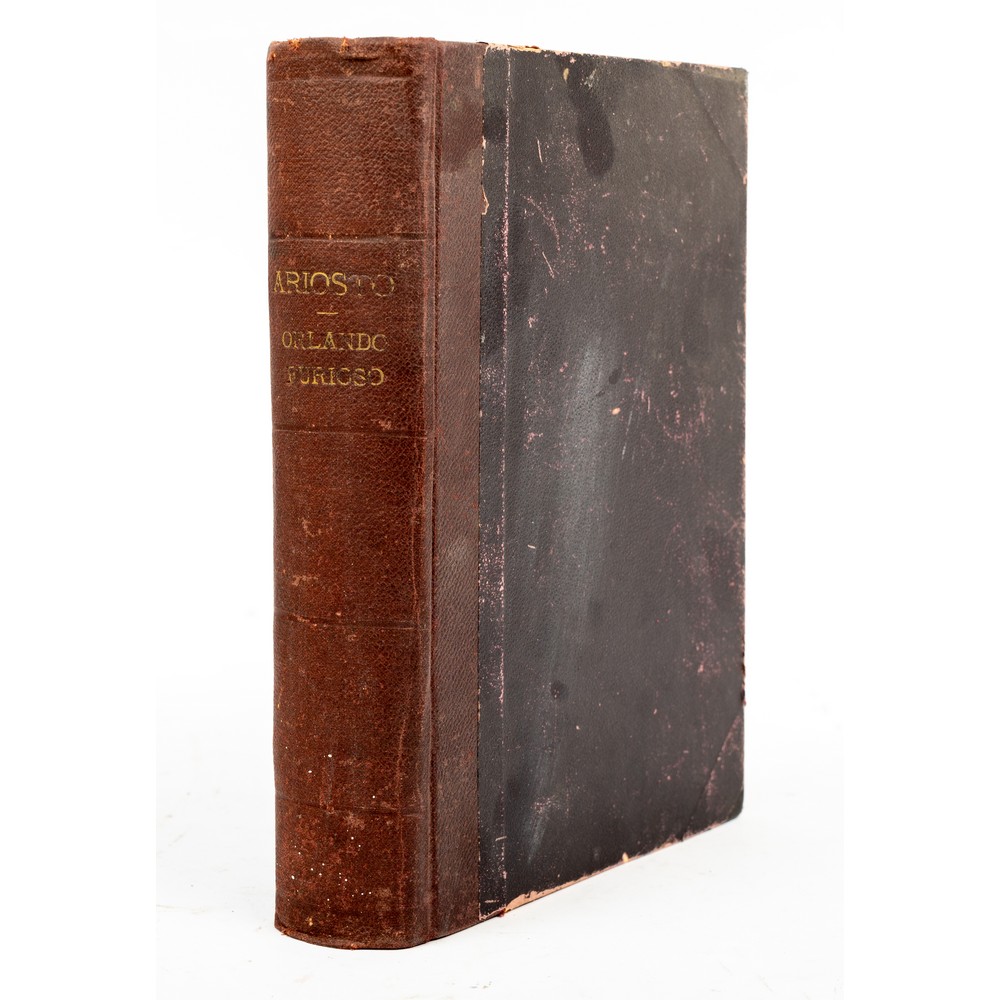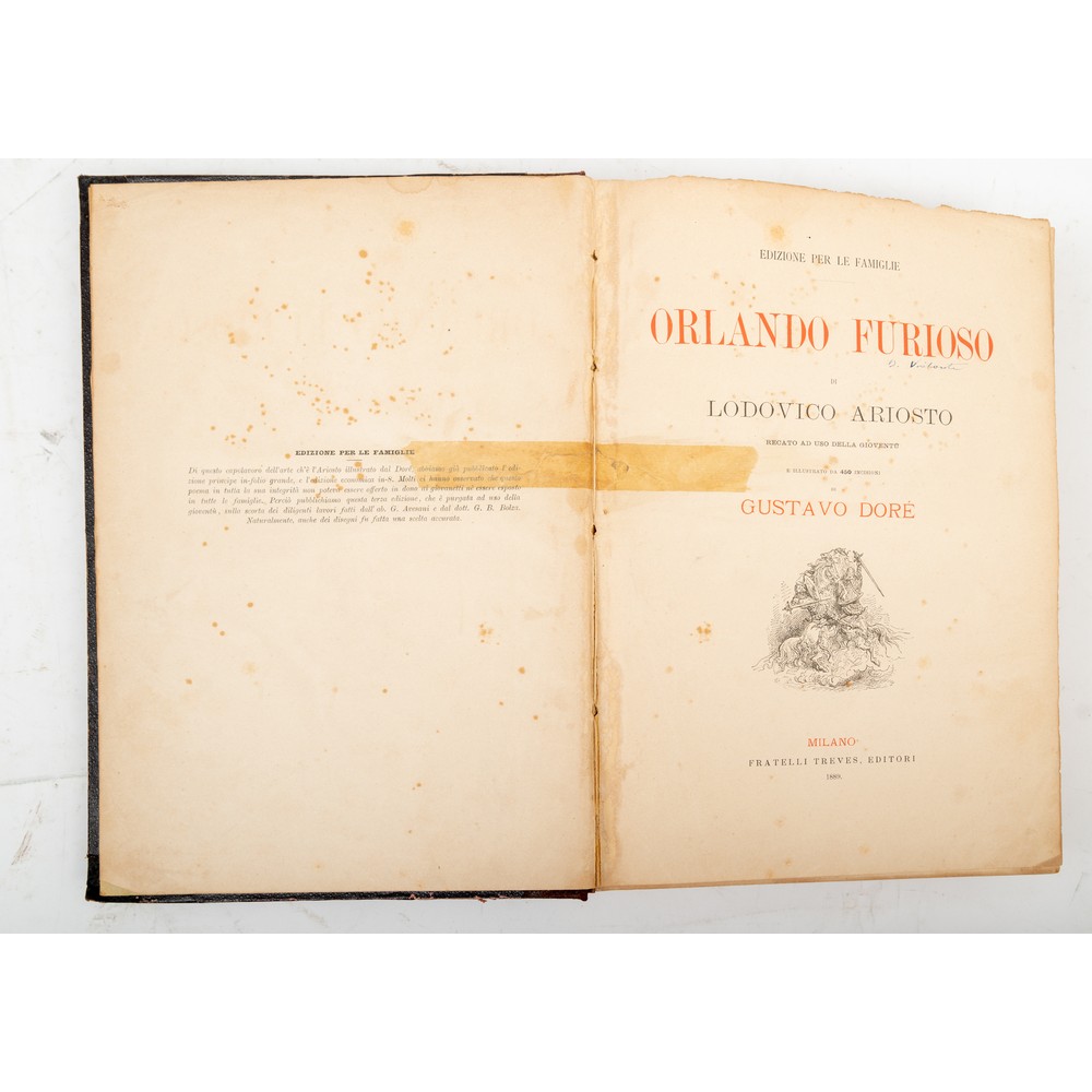 Ludovico Ariosto ORLANDO FURIOSO, ed. Milano, Fratelli Treves 1889. In 8° grande. Frontespizio in bicromia. Illustrato da 450 incisioni di Gustavo Dorè. Legatura coeva in mezza tela e piatti cartonati. Fioriture sparse. Rare bruniture. Pp. XI, 660 (1).