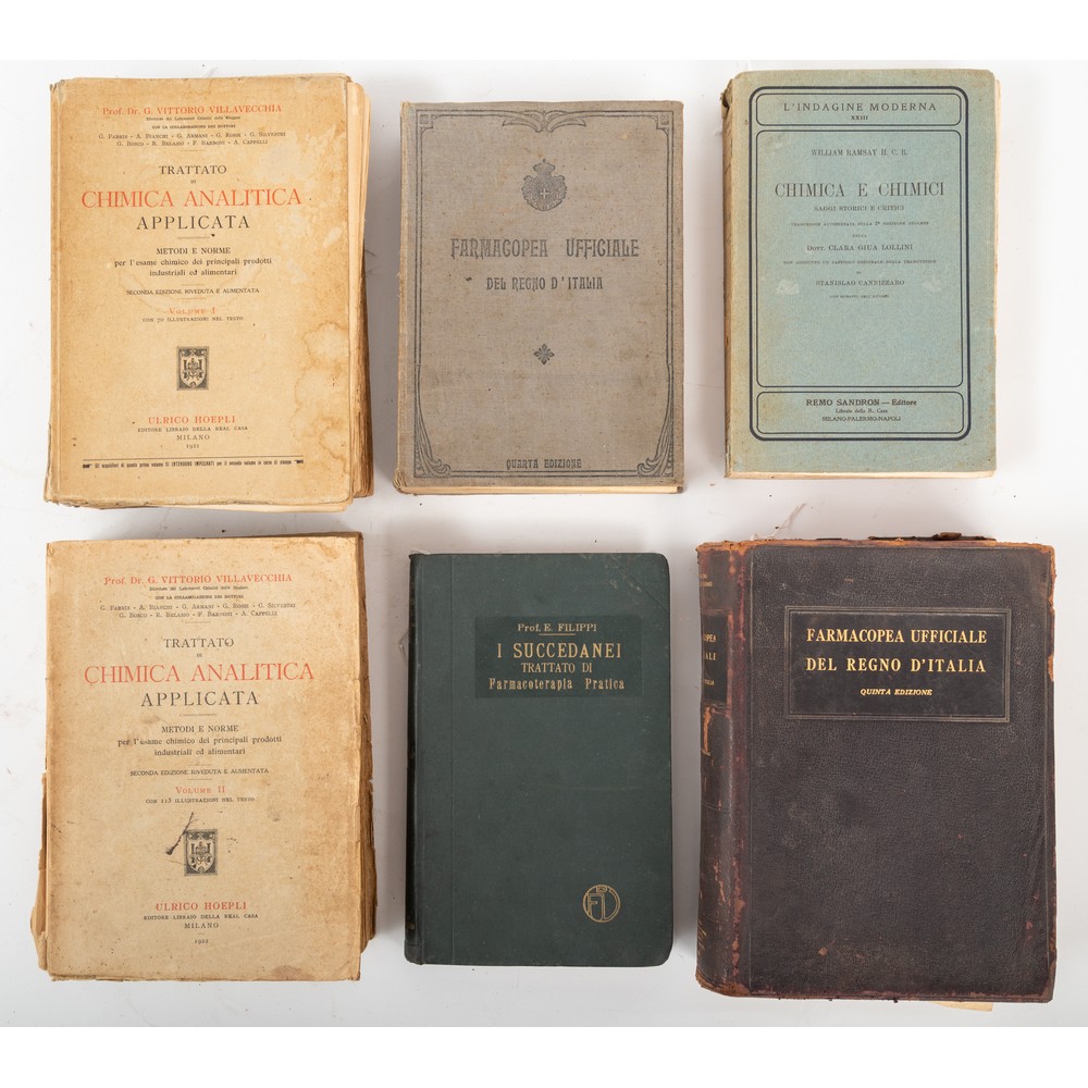SEI VOLUMI DI CHIMICA E FARMACEUTICA DI FINE XIX E INIZI DEL XX SECOLO: 1) AA. VV. FARMACOPEA UFFICIALE DEL REGNO D'ITALIA Quinta Edizione, ed. Roma, Provveditorato Generale dello Stato, Libreria, 1929 Anno VII. In 8°. Legatura editoriale in pelle con titoli in oro ai tasselli al dorso e al piatto anteriore. Al piatto posteriore stemma in oro del Fascio Littorio. Taglio superiore colorato. Usure e sporcizie ai piatti. Interno in ottime condizioni con qualche lieve brunitura sparsa. Pp. 717.2) Ettore Molinari CHIMICA ORGANICA. Parte prima e seconda, in 2 volumi, ed. Hoepli 1921 - 1922. Entrambi i volumi in buone condizioni. Dorsi leggermente slegati. Usure e sporcizie. Trattato di chimica generale ed applicata all'industria, Volume 1 e Volume II, parti prima e seconda. Brossura editoriale in cartonato flessibile con titoli ai piatti e ai dorsi. Con 70 illustrazioni nel Vol. I e 113 illustrazioni nel Vol. II. Pp. XX, 698; XVI, 8443) Eduardo Filippi I SUCCEDANEI. TRATTATO DI FARMACOPEA PRATICA, ed. Francesco Vallardi 1924. In 8°. Legatura editoriale in percallina rigida marginosa, con titoli impressi in oro al piatto e al dorso. Pp. VIII, 392. 4) Ministero dell’Interno FARMACOPEA UFFICIALE DEL REGNO D’ITALIA, ed. Tipografia delle Mantellate, Roma 1920. In 8°. Legatura editoriale in percallina rigida con titoli e stemma sabaudo impressi al piatto e al dorso. in buone condizioni. Piatti slegati. Pp. XVI, 523.5) William Ramsay CHIMICA E CHIMICI. SAGGI STORICI E CRITICI, ed. Remo Sandron, Palermo 1913. In 8°. Brossura editoriale con leggere usure d’uso e bruniture. Qualche sporcizia. Interno in perfette condizioni. Pp. 294.