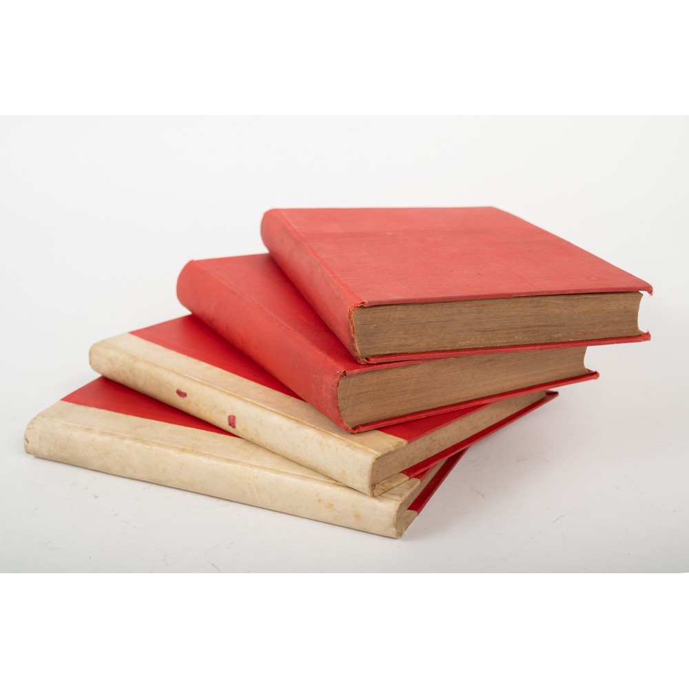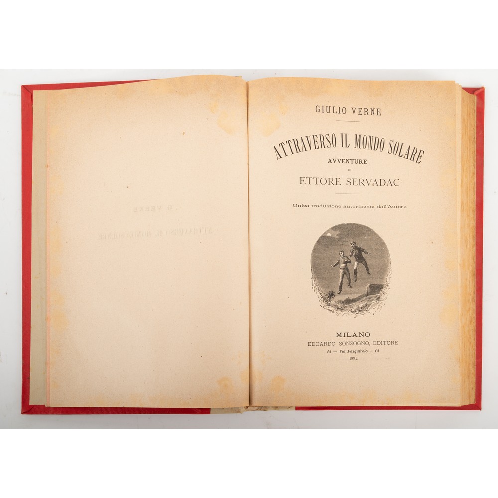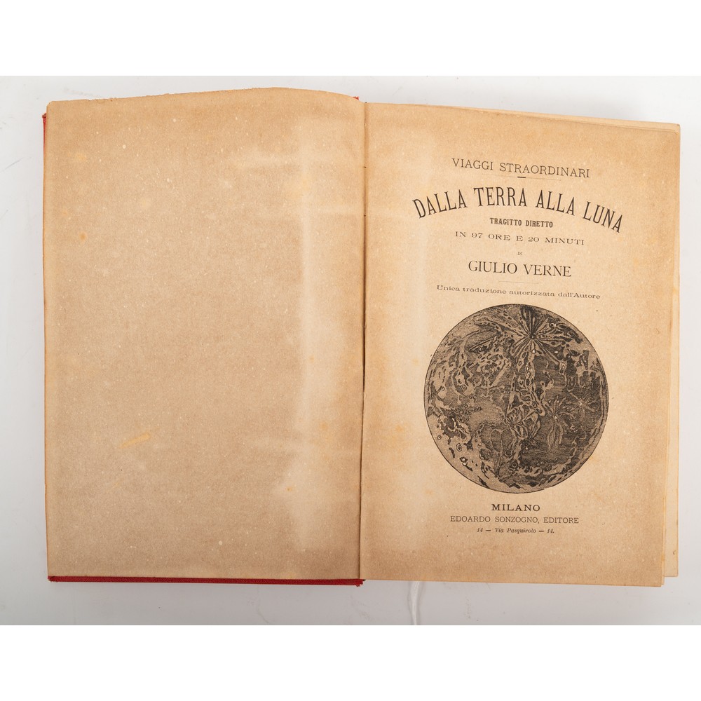 QUATTRO TOMI DI ROMANZI di Giulio Verne delle Edizioni Sonzogno che contengono sette romanzi . I Volumi della Collana Viaggi Straordinari, sono di dimensione in 8°. Due dei volumi presentano una rilegatura dei primi del Novecento in mezza pergamena con piatti telati rigidi. Gli altri due una rilegatura muta in telato rigido: 1) SCOPERTA DELLA TERRA, 1895. Pp. 464 con 68 incisioni di L. Benett e P. Philippoteaux nel testo e 38 fac-simili (secondo i documenti antichi) e carte di Dubail e Matthis. Esemplare in ottimo stato di conservazione. 2) ATTRAVERSO IL MONDO SOLARE. AVVENTURE DI ETTORE SARVADAC, 1891. Pp. 4, 428, illustrato. 3) DALLA TERRA ALLA LUNA, 1887. Pp. 4, 199. 4) INTORNO ALLA LUNA,1887. Pp. 4, 179. 5) VIAGGIO AL CENTRO DELLA TERRA, 1887. Pp. 219. 6) CINQUE SETTIMANE IN PALLONE. VIAGGIO DI SCOPERTA IN AFRICA, 1888, pp. 267; 7) AVVENTURE DEL CAPITANO HATTERAS, 1889. Pp. (4), 460 con molte incisioni in nero nel testo.