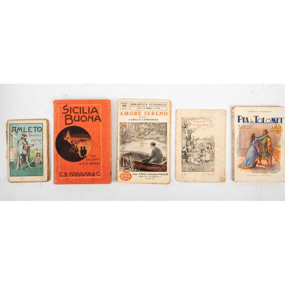 CINQUE OPERE LETTERARIE in edizioni popolari: 1) Shakespeare AMLETO, ROMANZO POPOLARE, ed. Cesare Cioffi, Milano s. d. (ma primi del ‘900). In 16°. Brossura editoriale illustrata. Tagli in barbe. Usure d’uso. Pp. 79. Rarissimo. 2)Marchesa Colombi PICCOLO EROE, ed. Remo Sandron 1900. In 8° piccolo. Collana Per il Mondo Piccino. Brossura editoriale illustrata. Usure d’uso. Pp. 19. Introvabile. 3)Carolina Invernizio PIA DE’ TOLOMEI, ed. Barion 1938. In 8° piccolo. Brossura editoriale illustrata. Tagli in barbe. Leggere usure e strappetti alla brossura. Pp. 155.4) Camillo Lemonnier AMORE SERENO, ed. Sonzogno – Matarelli 1925. In 8°. La brossura editoriale illustrata si presenta slegata. Leggere usure d’uso. Pubblicazione bimensile, n. 29. Pp. 96. 5) G. E. Nuccio SICILIA BUONA. TRE RACCONTI DI G. E. NUCCIO, ed. G. B. Paravia s.d. (ma primi del ‘900). Brossura editoriale illustrata. In 8°. Leggere usure d’uso. Racconti illustrati da Scarpelli. Pp. 164.