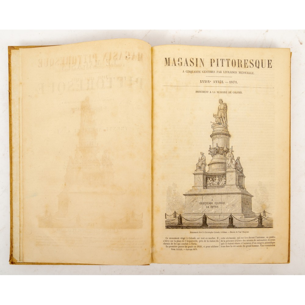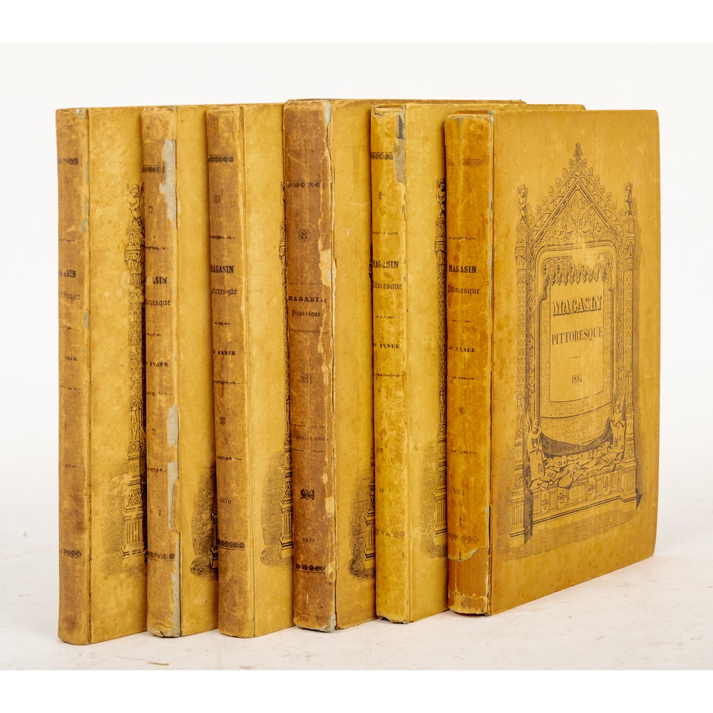 SEI VOLUMI DEL XIX SECOLO DEL MAGASIN PITTORESQUE. Le annate comprendono il 1849 (pp. 408), 1870 (pp. 412), 1871 (pp. 412), 1872 (pp. 412), 1874 (pp. 412) , 1884 (pp. 412).Tutti i volumi con legatura editoriale in cartonato rigido illustrato a stampa con l’incisione di J. Jackson. Tagli colorati. I volumi presentano fioriture sparse e leggere bruniture del tempo. Pubblicato per la prima volta nel 1833, Il Magasin Pittoresque si caratterizzava per la qualità e quantità delle sue incisioni in calcografia. Ebbe uno straordinario successo a tal punto che la sua pubblicazione durò fino al 1938 fermandosi con l’inizio della seconda guerra mondiale.