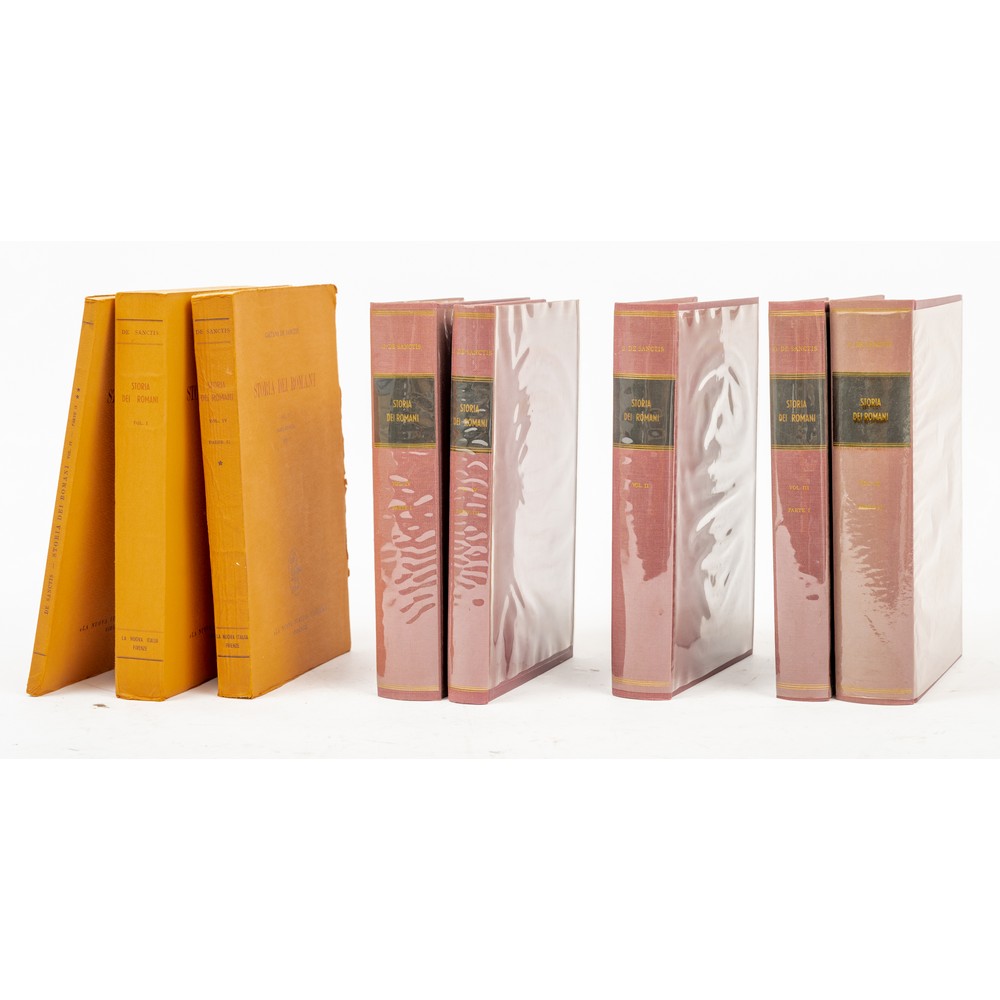 OTTO VOLUMI DI STORIA DEI ROMANI di Gaetano De Sanctis, ed. La Nuova Italia, Firenze 1956 – 1964. Opera completa in 8 volumi. Tre in brossura editoriale e cinque in legatura editoriale con acetato protettivo. Cm 25 x 17 (volumi in brossura) e 24 x 16 (volumi in legatura). La straordinaria e fondamentale opera monumentale sulla storia di Roma e dei suoi costumi. Pp. XII 445, XII 552, XV 420, XI 711, XVI 634, XII 376, VII 169, VIII 309. Alcuni volumi ancora intonsi.