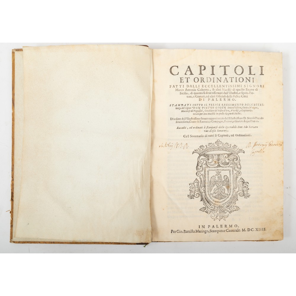 CAPITOLI ET ORDINATIONI…, ed. Gio. Battista Maringo Stampatore Camerale, in Palermo MDCXIIII. In 4° ( ma rifilato, cm 27 X 20) e incompleto alle ultime carte. Rilegatura in mezza pelle piatti in cartonato marmorizzato. Carte sporche e presenza di macchie e bruniture. Lavori di tarlo in alcune carte. Gore di umidità. Necessita di pulitura. Pp. (10), 123, 100, (10).