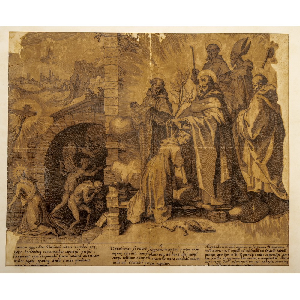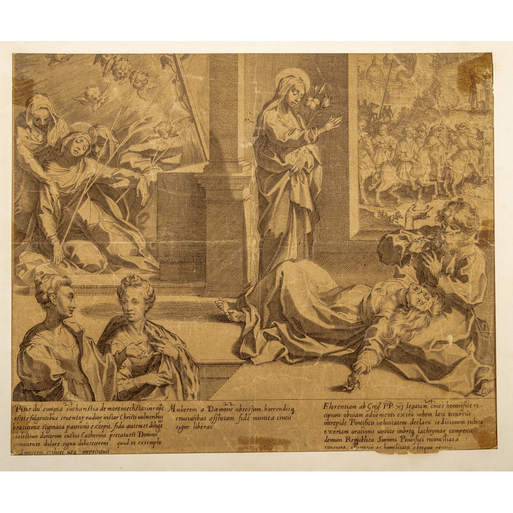 TRE CALCOGRAFIE del XVIII secolo. La prime due raffiguranti scene di esorcismo, la terze raffigurante Clemente XIII e datata 1758.