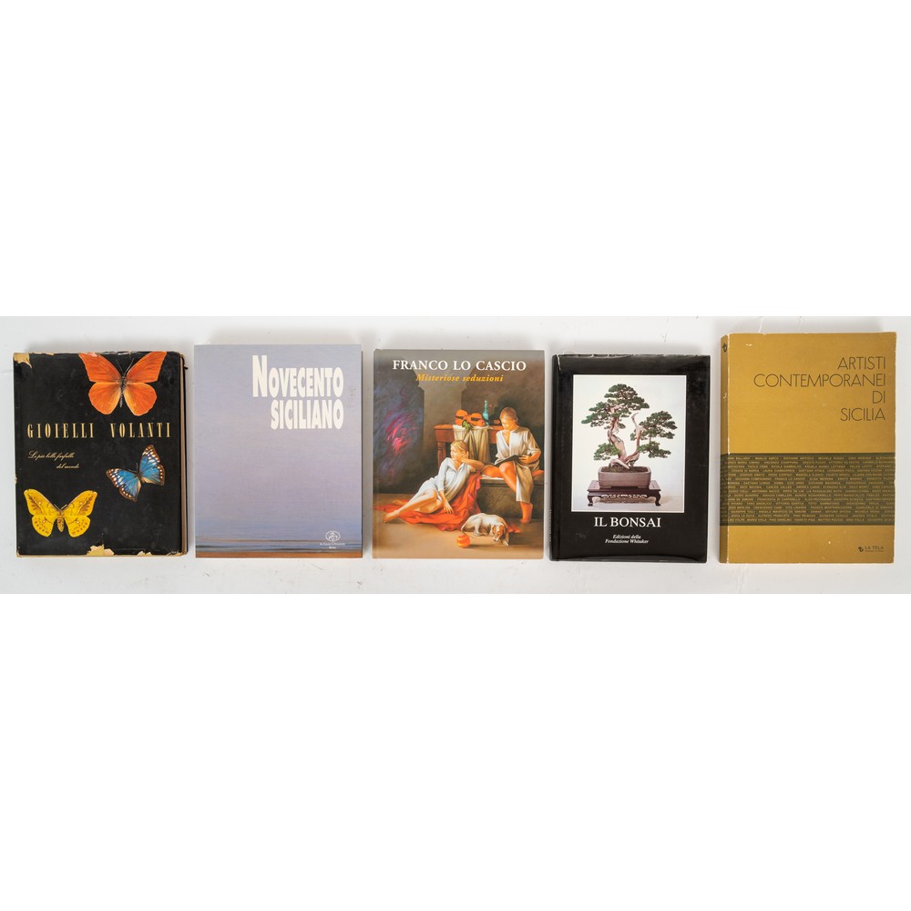 CINQUE VOLUMI D’ARTE IN MISCELLANEA: 1) Aldo Forbice FRANCO LO CASCIO MISTERIOSE SEDUZIONI, ed. Palermo 2007. Una monografia sul pittore palermitano Franco Lo Cascio che prende spunto dalla mostra del 2007. Legatura editoriale rigida plastificata e illustrata. Cm 31 x 25. Pp. 277. 2) AA. VV. ARTISTI CONTEMPORANEI DI SICILIA, ed. Edizioni d’Arte, Palermo 1976. Presentazione di Francesco Carbone. Cm 34 x 24. Brossura editoriale cartonata flessibile figurata. Pp. 231. Un interessante excursus sui pittori siciliani del dopoguerra “accomunati nella stupefacente solarità”. Pp. 230. 3) Maria Antonietta Spadaro – a cura di - NOVECENTO SICILIANO, ed. Il Cigno 2003. Cm 32 x 25. Catalogo della mostra itinerante (Minsk, Mosca, Barcellona e Palermo) tenutasi nel periodo Ottobre 2003 – Maggio 2004. Brossura editoriale illustrata con ali. Pp. 347. 4) AA. VV. IL BONSAI, ed. Fondazione Whitaker, Palermo 1983. Legatura editoriale in tela nera con titoli impressi in oro al piatto e al dorso. Sopraccoperta editoriale illustrata. Cm 31 x 23. Pp. 109.5) AA. VV. GIOIELLI VOLANTI. LE PIU’ BELLE FARFALLE DEL MONDO, ed. Aldo Martello Editore, Milano 1955. Bella legatura editoriale in tela con una farfalla impressa in oro al piatto e titoli e fregi in oro entro tasselli al dorso. Sopraccoperta illustrata. Cm 31 x 25. Pp. 191.