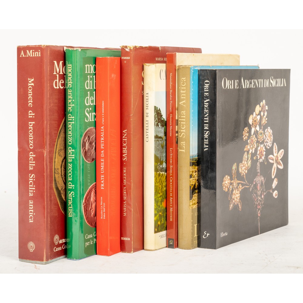 OTTO VOLUMI DI ARTE E ARCHEOLOGIA SULLA SICILIA: 1) Marisa Sedita Migliore SABUCINA. STUDIO SULLA ZONA ARCHEOLOGICA DI CALTANISSETTA, ed. Salvatore Sciascia 1981. Brossura editoriale con sopraccoperta in carta illustrata con ali. Pp. 198 con sette carte planimetriche della zona archeologica più volte ripiegate e poste in un risvolto a sacca della legatura. Cm 32 x 22. 2) Maria Concetta Di Natale ORI E ARGENTI DI SICILIA DAL QUATTROCENTO AL SETTECENTO, ed. Electa 1989. Cm 28 x 25. Brossura editoriale illustrata con ali. Un fondamentale volume sull’arte orafa siciliana nel periodo del suo massimo splendore. Con centinaia di foto a colori e in b/n. Pp. 418. 3) Adolfo Minì MONETE ANTICHE DI BRONZO DELLA ZECCA DI SIRACUSA, ed. Cassa Centrale di Risparmio V. E. 1977. Cm 31 x 24. Bella legatura in tela azzurra con titoli impressi in oro e sopraccoperta illustrata. Pp. 191 stampate su carta patinata. In perfette condizioni. 4) Adolfo Minì MONETE DI BRONZO DELLA SICILIA ANTICA, ed. Cassa Centrale di Risparmio V. E. 1979. Cm 31 x 24. Bella legatura in tela con titoli e figura impressi a inchiostro e sopraccoperta illustrata. Contropiatti e guardie con mappa della Sicilia. Pp. 505 (2) stampate su carta patinata. In perfette condizioni.5) Alba Drago Beltrandi CASTELLI DI SICILIA, ed. Silvana 1956. Con le fotografie di Fosco Maraini. Con una bella mappa della Sicilia a doppia pagina. Bella legatura in tela grigia con titoli impressi in oro e sopraccoperta illustrata. Volume contenuto in custodia in cartone muto editoriale. Pp. 190 (4). 6) Leonard Von Matt LA SICILIA ANTICA, ed. Stringa, Genova 1964. Legatura in tela con stemma della Trinacria impressa in oro al piatto e titoli in oro al dorso. Sopraccoperta illustrata. Pp. 238.7) Rosolino La Mattina / Felice Dell’Utri FRATE UMILE DA PETRALIA. L’ARTE E IL MISTICISMO, ed. Lussografica 1987. Cm 30 x 22. Brossura editoriale illustrata. Stampato su carta patinata. Pp. 248 (14). Con XLIX tavole a colori a tutta pagina. 8) Massimiliano Marafon Pecoraro / Eleonora Marrone LO STUDIO BASILE CROCEVIA DI ARTI E MESTIERI, ed. 40due Edizioni2013. Cm 31 x 22. Legatura editoriale plastificata rigida illustrata. Pp. 144 con una tavola del Teatro Massimo Vittorio Emanuele ( Teatro Massimo) più volte ripiegata in fine.