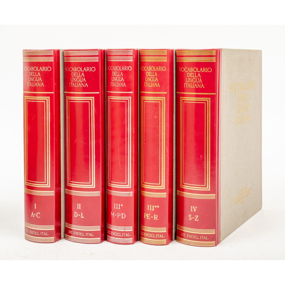 AA. VV. VOCABOLARIO DELLA LINGUA ITALIANA, ed. Istituto della Enciclopedia Italiana, Roma 1986 – 1994. In 5 volumi. Volumi come nuovi. Un’opera monumentale che è ormai un classico della lingua italiana. Con centinaia di migliaia di lemmi. Legature editoriali in mezza pelle e piatti telati rigidi. Titoli e fregi impressi in oro ai piatti e ai dorsi. Cm 29 x 21.