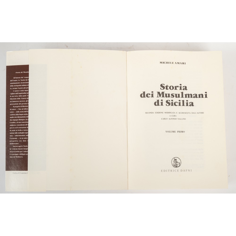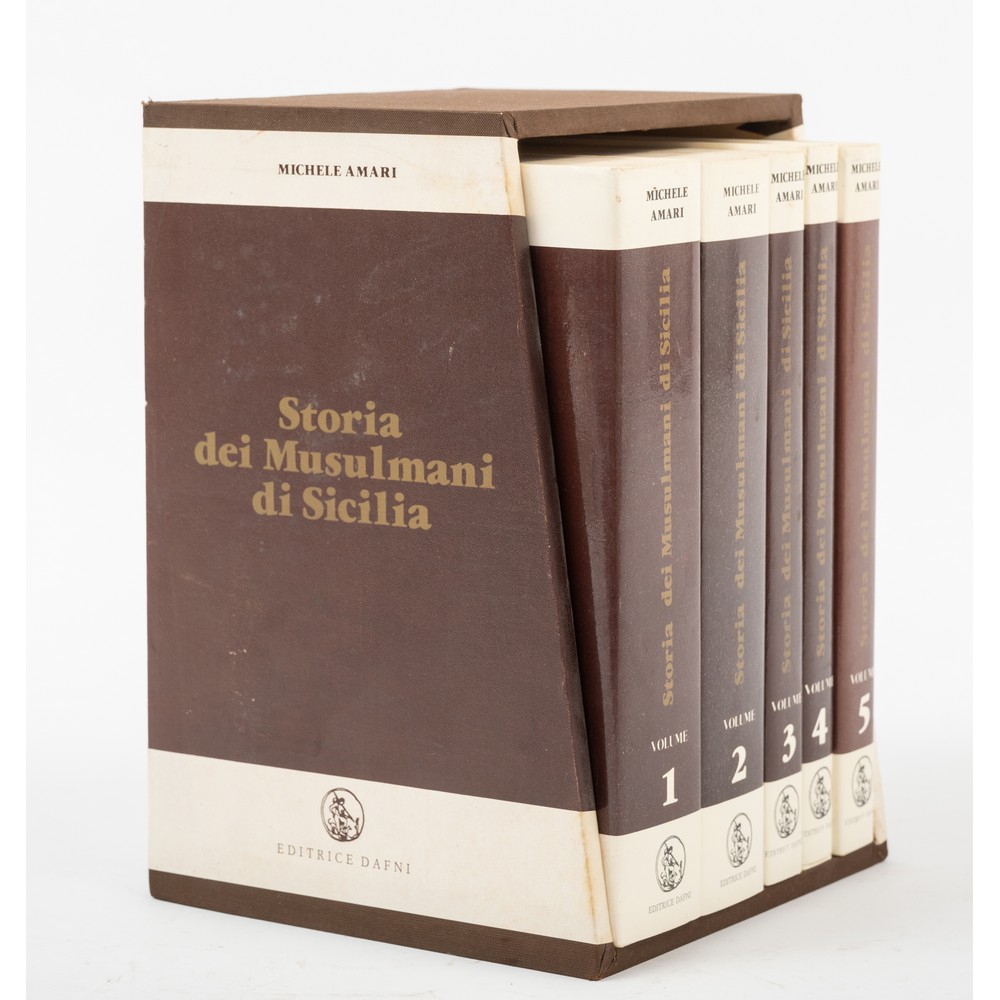 CINQUE VOLUMI IN COFANETTO: Michele Amari STORIA DEI MUSULMANI DI SICILIA, ed. Dafni 1986 ma ristampa anastatica della edizione Prampolini del 1933. Seconda edizione modificata e accresciuta dall'autore a cura di Alfonso Nallino. Tre volumi in cinque tomi, contenuti in un bel cofanetto editoriale in legno rivestito in tela e con titoli applicati a specchio dei piatti. Brossure editoriali flessibili illustrate e sopraccoperte editoriali illustrate a specchio. In 8°. Pp. XLIII, 677; XIX, 630; 350/ 352-670/ XI, 672-1038 (continuativi). Sporadiche sporcizie ai tagli.