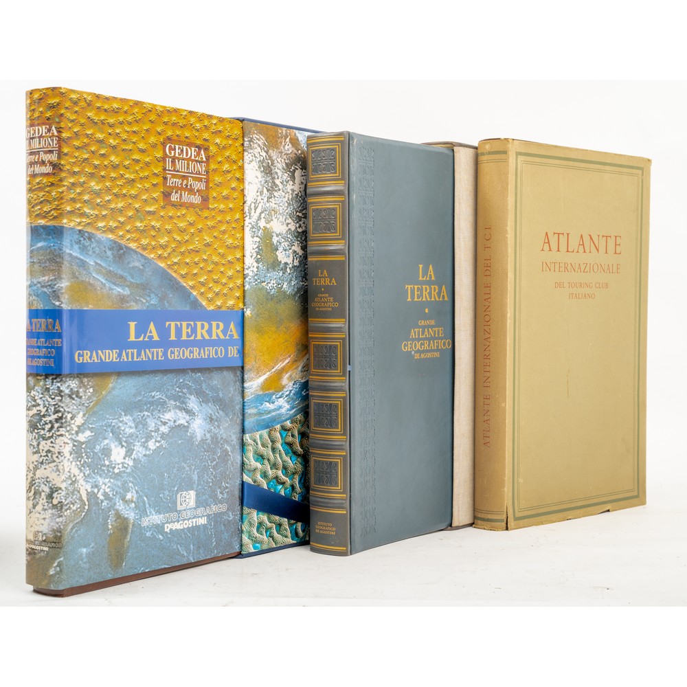 TRE ATLANTI: 1) AA. VV. ATLANTE INTERNAZIONALE DEL TOURING CLUB ITALIANO, ed. Milano 1968. In formato atlantico (cm 50 x 32). Legatura editoriale con sopraccoperta in carta. Titoli in oro al piatto e al dorso. Pp. 173 con numerose carte più volte ripiegate. 2) AA. VV. LA TERRA. GRANDE ATLANTE GEOGRAFICO DE AGOSTINI, ed. Novara 1999. In formato atlantico ( cm 49 x 33). Legatura editoriale in finta pelle imbottita con sopraccoperta illustrata in carta patinata. Titoli in oro al piatto e ai tasselli al dorso. Pp. 512 con le carte geografiche dei Paesi del Mondo. Volume contenuto in cofanetto editoriale rigido illustrato. 3) AA. VV. LA TERRA. GRANDE ATLANTE GEOGRAFICO DE AGOSTINI, ed. Novara 1998. In formato atlantico ( cm 49 x 33). Edizione speciale con coperta in pelle blu di vitello pieno fiore volonata, impressioni a secco e in oro zecchino su trancia a caldo, cordoli decorativi sul dorso. Pp. 512 stampate su pregiata carta di tonalità avorio, grandi carte geografiche rilegate con braghettatura. Volume contenuto in cofanetto editoriale in pelle e tela. All’interno pergamena di certificazione dell’opera.