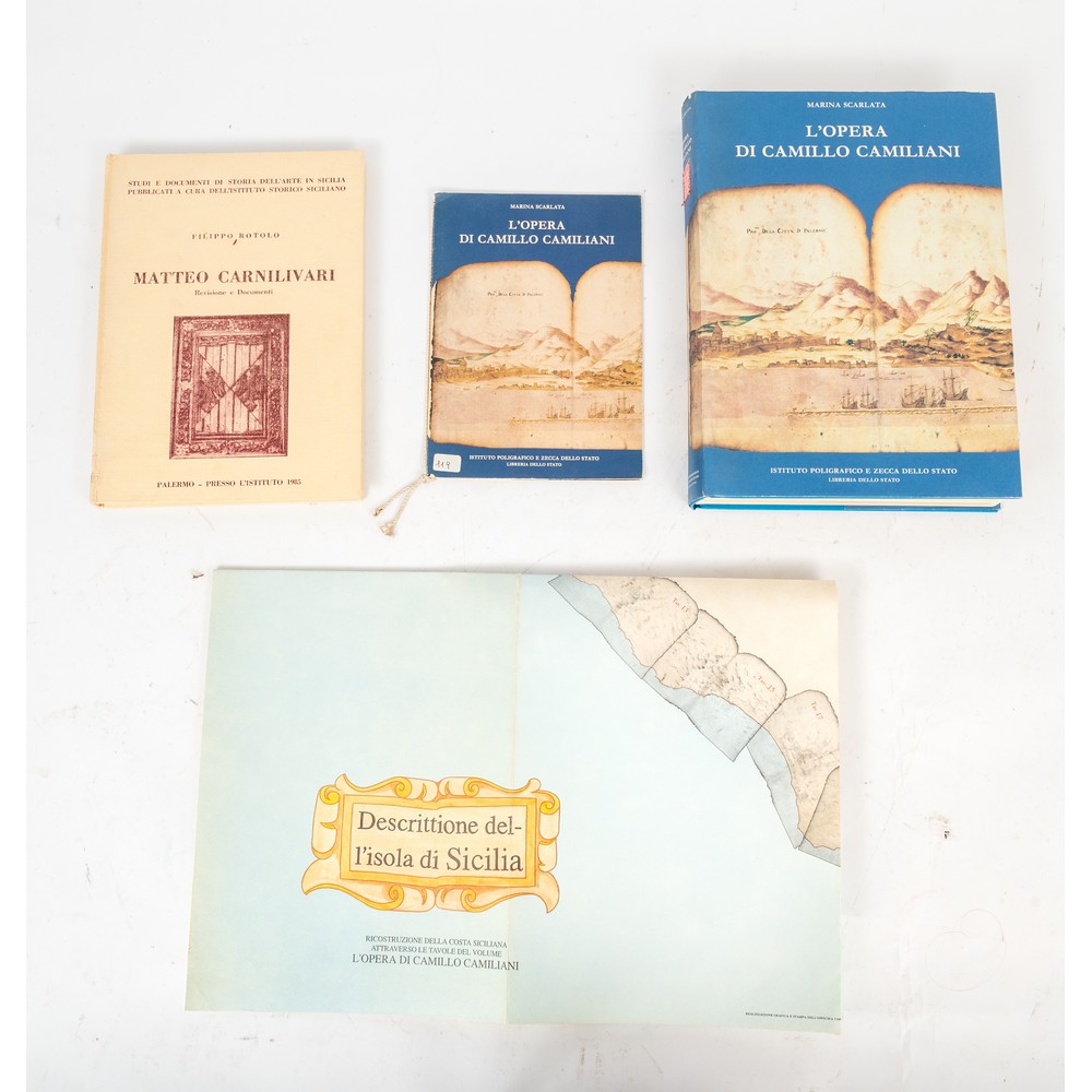 DUE VOLUMI D’ARTE E STORIA: 1) Filippo Rotolo MATTEO CARNILIVARI, ed. Palermo Istituto Storico Siciliano 1985. Cm 30 x 22. Legatura editoriale in cartonato finto telato con titoli e immagine al piatto a stampa. Titoli a stampa anche al dorso. Stampato su carta patinata. Pp. 173. In ottime condizioni. 2) Marina Scarlata L’OPERA DI CAMILLO CAMILLIANI, ed. Istituto Poligrafico e Zecca dello Stato, Roma 1993. Opera in folio. Elegante legatura editoriale in tela azzurra con titoli impressi in oro al piatto e al dorso. Contropiatti e guardie decorate. Sopraccoperta editoriale in carta illustrata. Custodia editoriale rigida decorata. Con un notevole apparato di tavole f. t. più volte ripiegate. Pp. VIII, 686. Il volume è corredato di carta geografica “Descrittione dell’Isola di Sicilia”, esterna al volume ma parte della pubblicazione e dall’opuscolo di presentazione dell’opera.