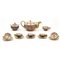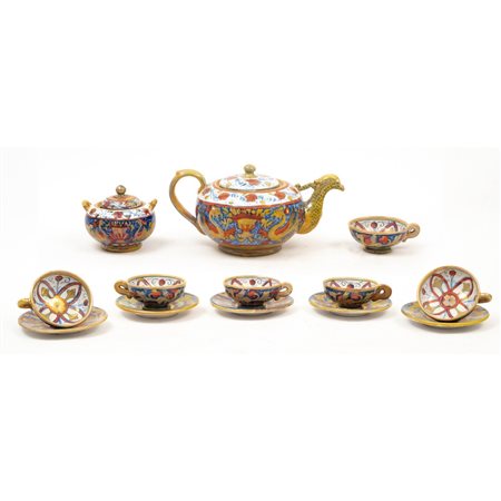 Teiera, zuccheriera, 6 tazze, 5 piattini in ceramica decorata (usura e filatura).