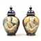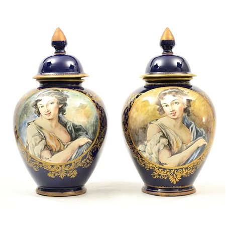 COPPIA DI POTICHE in porcellana nei toni del blu con medaglione dipinto a mano raffigurante ritratto di donna.