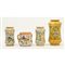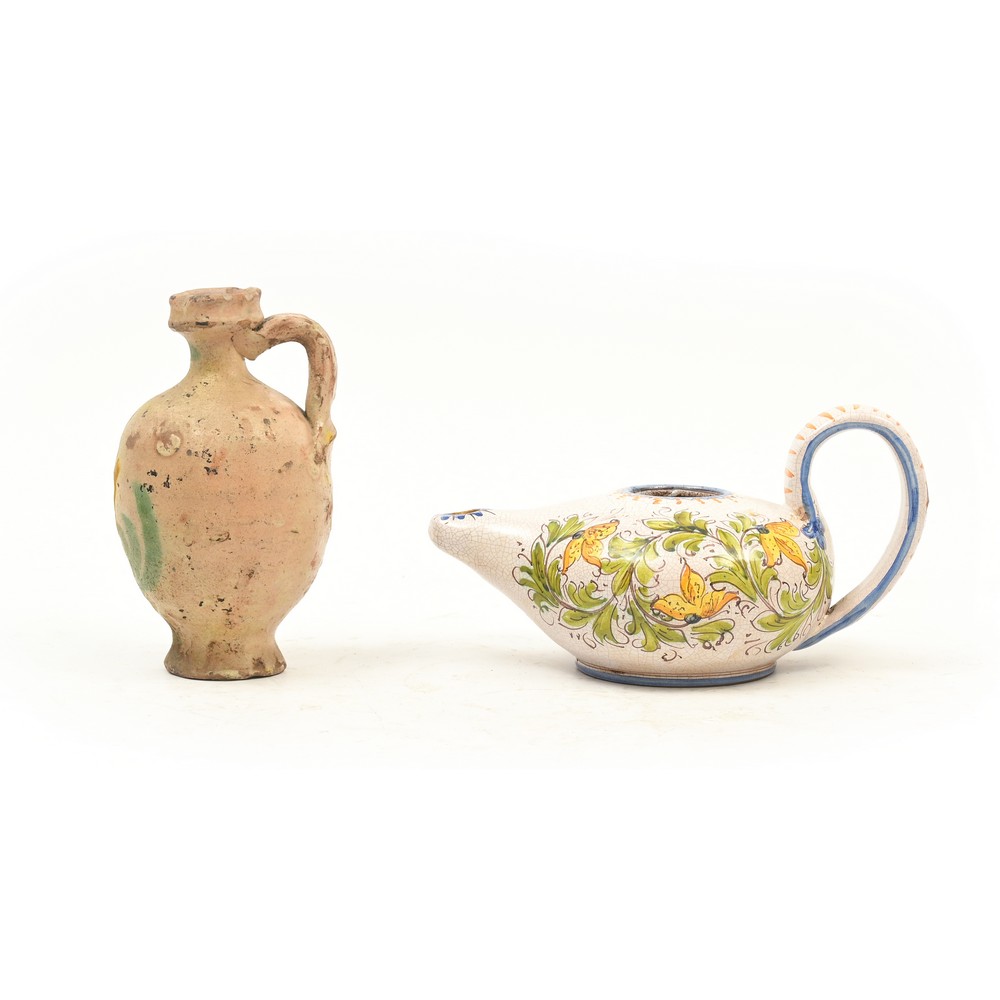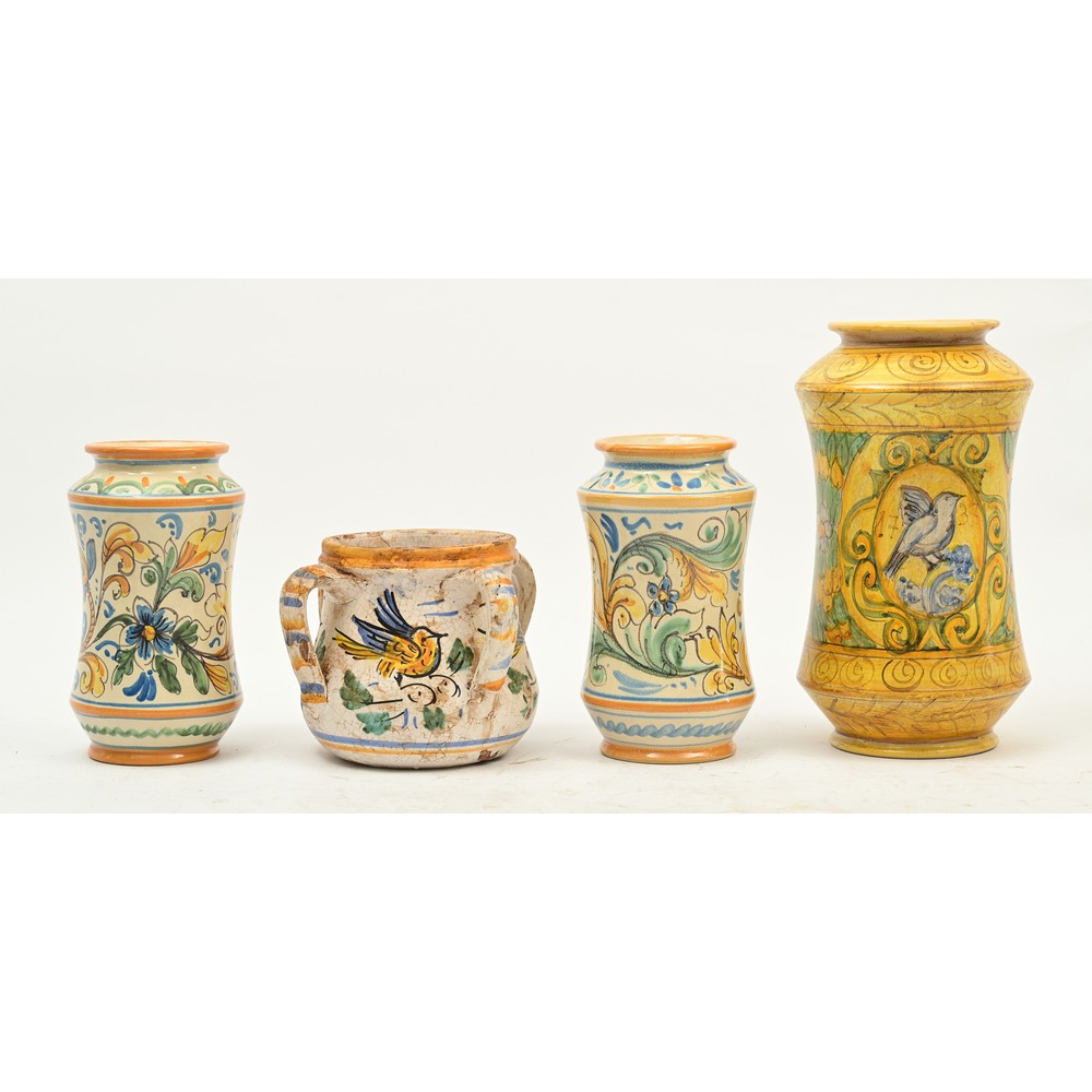 Tre albarelli, fiasca, vaso e versatoio in ceramica smaltata e dipinta.