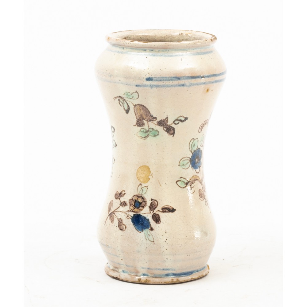 Albarello in ceramica smaltata e decorata a motivo fogliaceo.